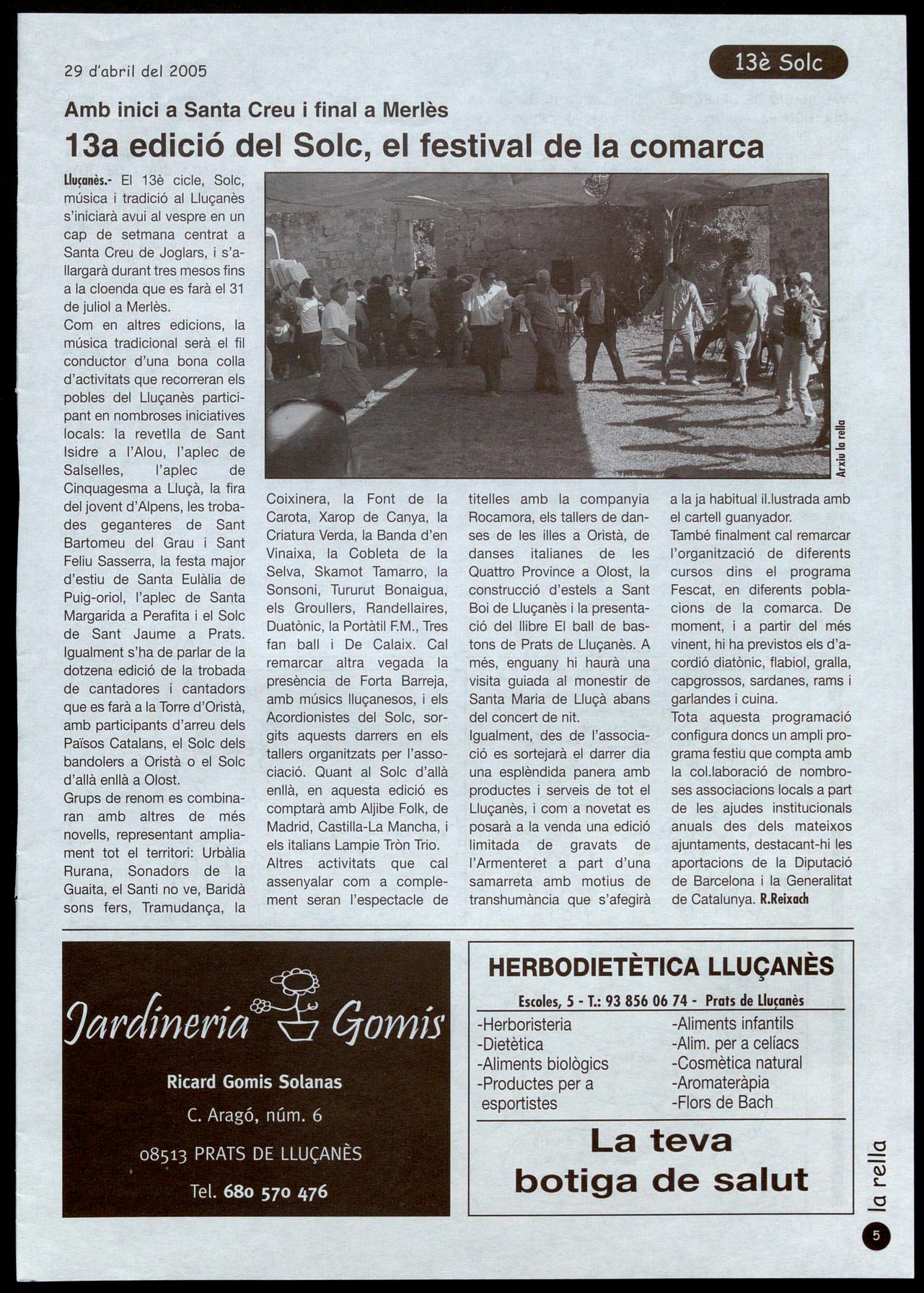 Lluçanès.- El 13è cicle, Sale, música tradició al Lluçanès s'iniciarà avui al vespre en un cap de setmana centrat a Santa Creu de Joglars, s'allargarà durant tres mesos fins a la cloenda que es farà el 31 de juliol a Merlès.