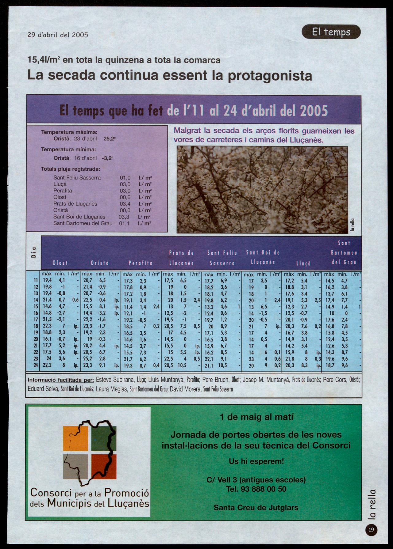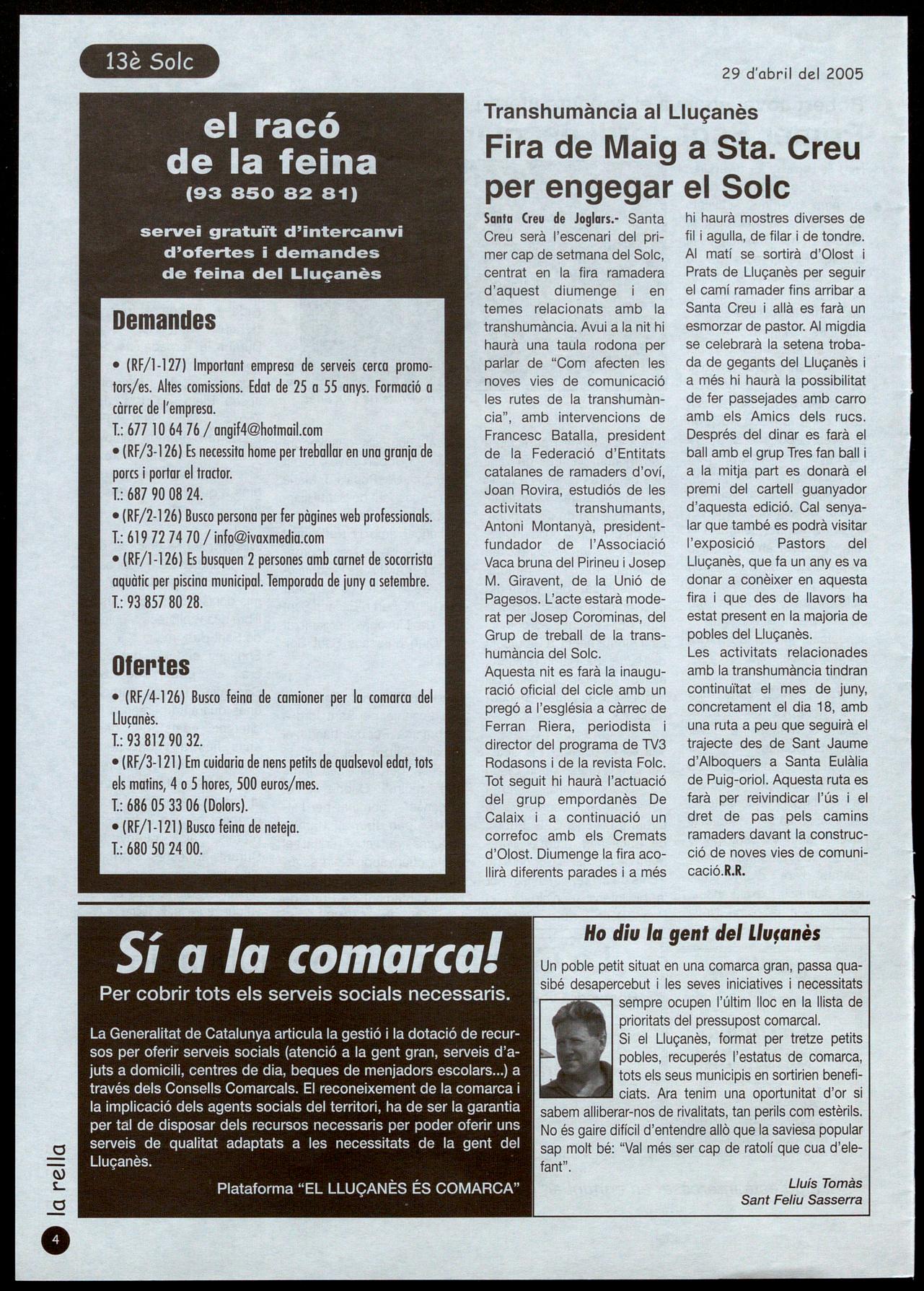 S'INSTAL·LA A SANTA CREU DE JUTGLARS. El consorci del Lluçanès que es va formar l'any 2001 amb seu inicial a Sant Boi de Lluçanès, es va traslladar el dia 8 d'abril a Santa Creu de Jutglars concretament a l'antiga escola d'aquesta població que es va habilitar per tal de que es pogués dur a terme el trasllat del consorci. Aqui s'hi tractaran totes les competències que fins al moment estaven dividides en dues seus, una a Sant Boi del Lluçanès on es tractaven els temes d'administració, cultura i turisme territori medi ambient; i l'altra a Sant Bartomeu del Grau, aquesta última més recent constituida a finals de 2004 en què s'hi tractaven els temes de tecnologies de la informació la comunicació (TIC), promoció econòmica juventut.M.V.