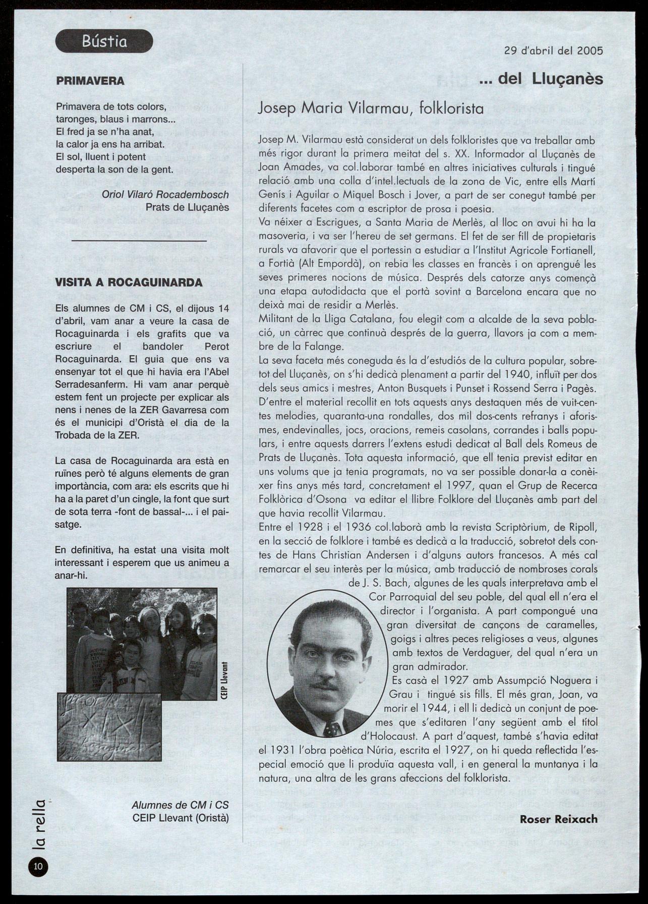 bre i la lectura. També el coLlegi Presentació de la Mare de Déu va organitzar una setmana cultural que va comptar amb la participació de diferents persones i entitats del poble. Cada dia es va dedicar a un tema cultural: pintura, patrimoni, música danses tradicionals i els alumnes van participar en les activitats sota el lema Treballem pel poble: valorem l'esforç de les persones. R.R.