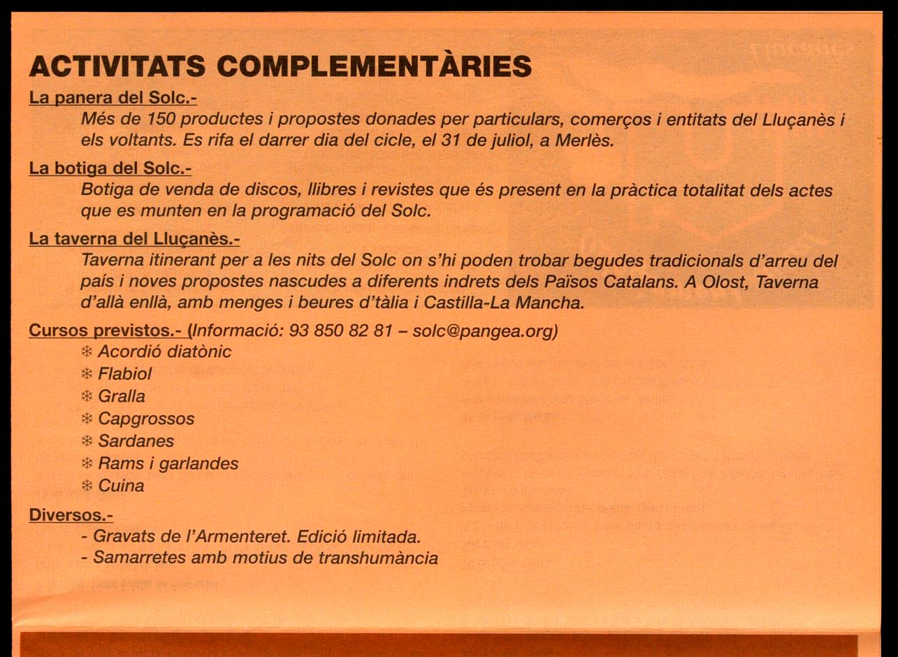 Taverna itinerant per a les nits del Solc on s'hi poden trobar begudes tradicionals d'arreu del país i noves propostes nascudes a diferents indrets dels Països Catalans. A Olost, Taverna d'allà enllà, amb menges i beures d'tène i Castilla-La Mancha.