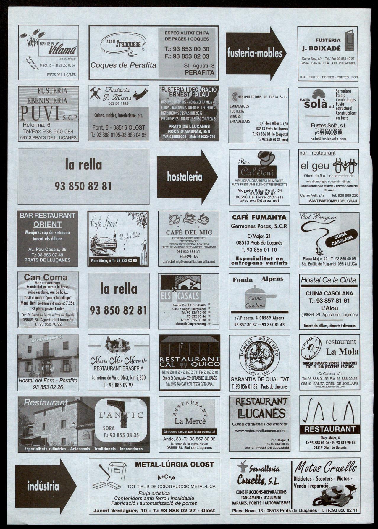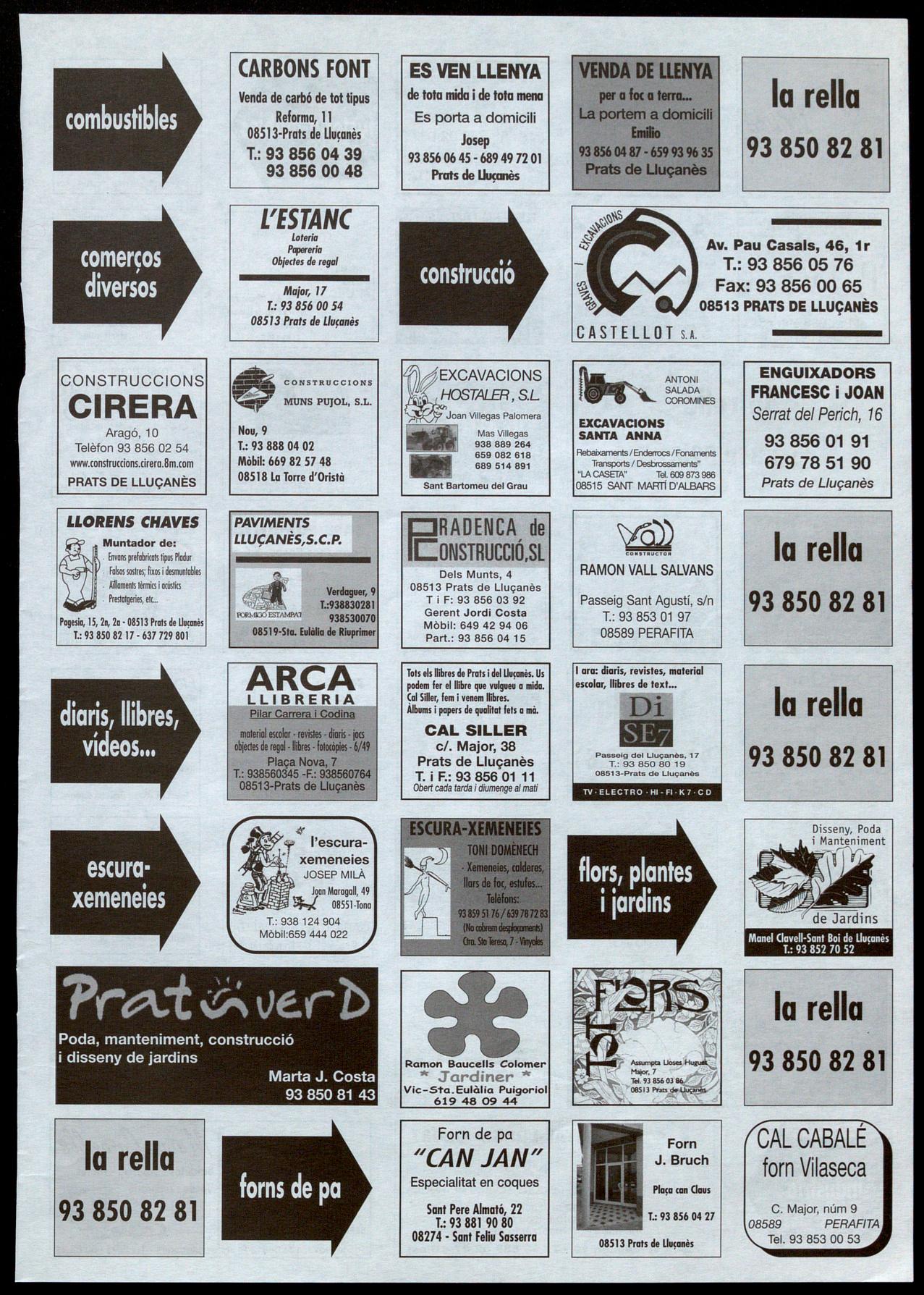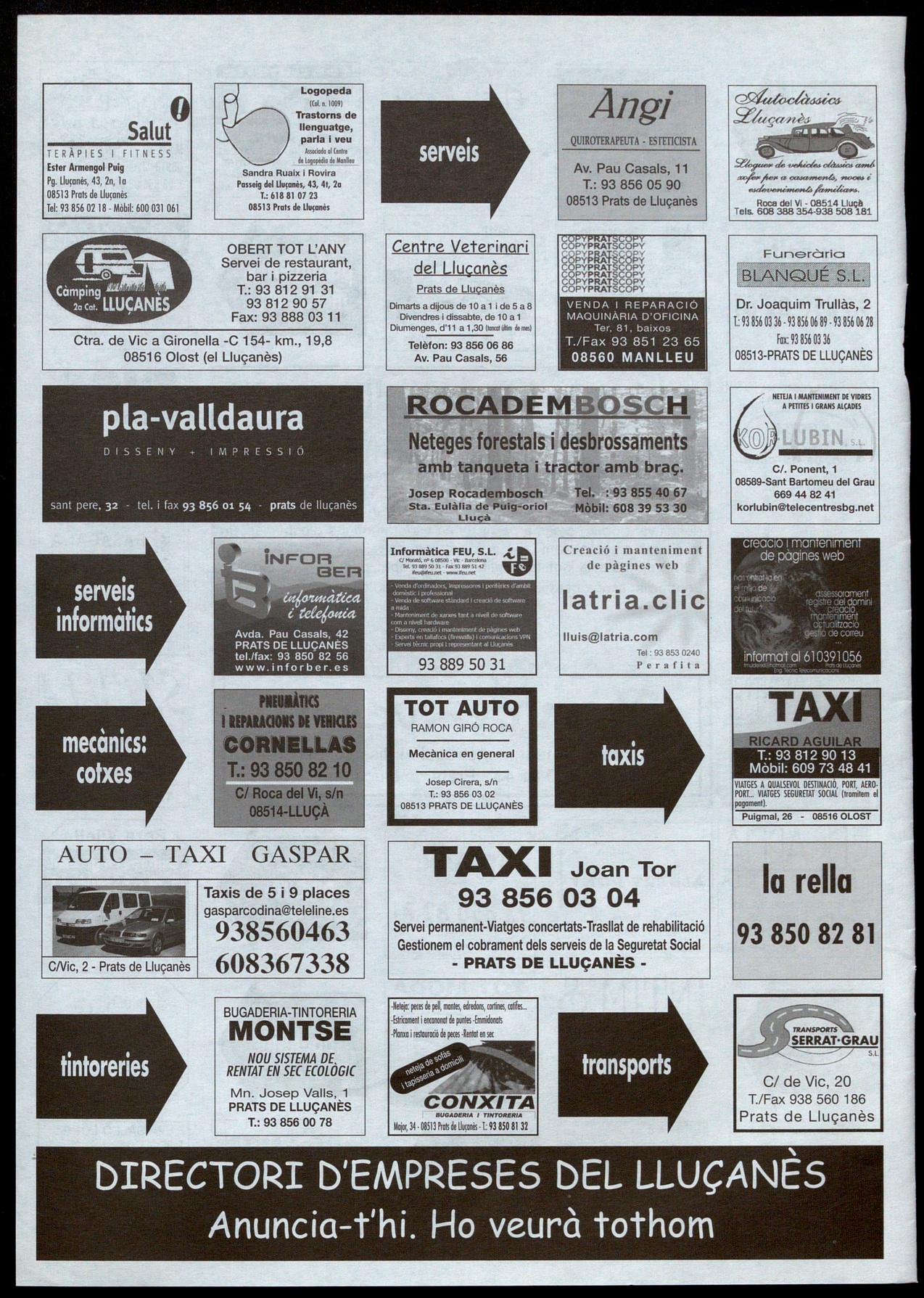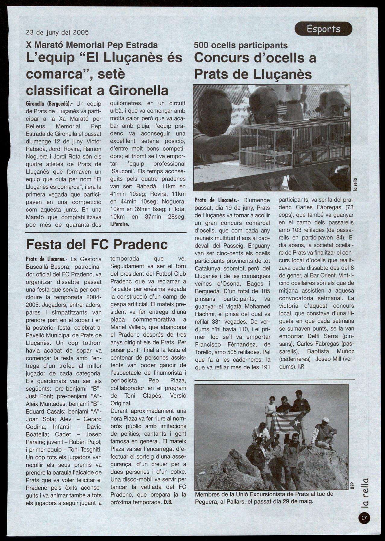 Profs de L1uçanès.- Diumenge passat, dia 19 de juny, Prats de Lluçanès va tornar a acollir un gran concurs comarcal d'ocells, que com cada any reuneix multitud d'aus al capdevall del Passeig. Enguany van ser cinc-cents els ocells participants provinents de tot Catalunya, sobretot, però, del Lluçanès i de les comarques veïnes d'Osona, Bages Berguedà. D'un total de 105 pinsans participants, va guanyar el vigatà Mohamed Hachmi, el pinsà del qual va refilar 381 vegades. De ver-durns n'hi havia 110, el primer lloc se'l va emportar Francisco Férnandez, de Torelló, amb 505 refilades. Pel que fa a les caderneres, la que va refilar més de les 191