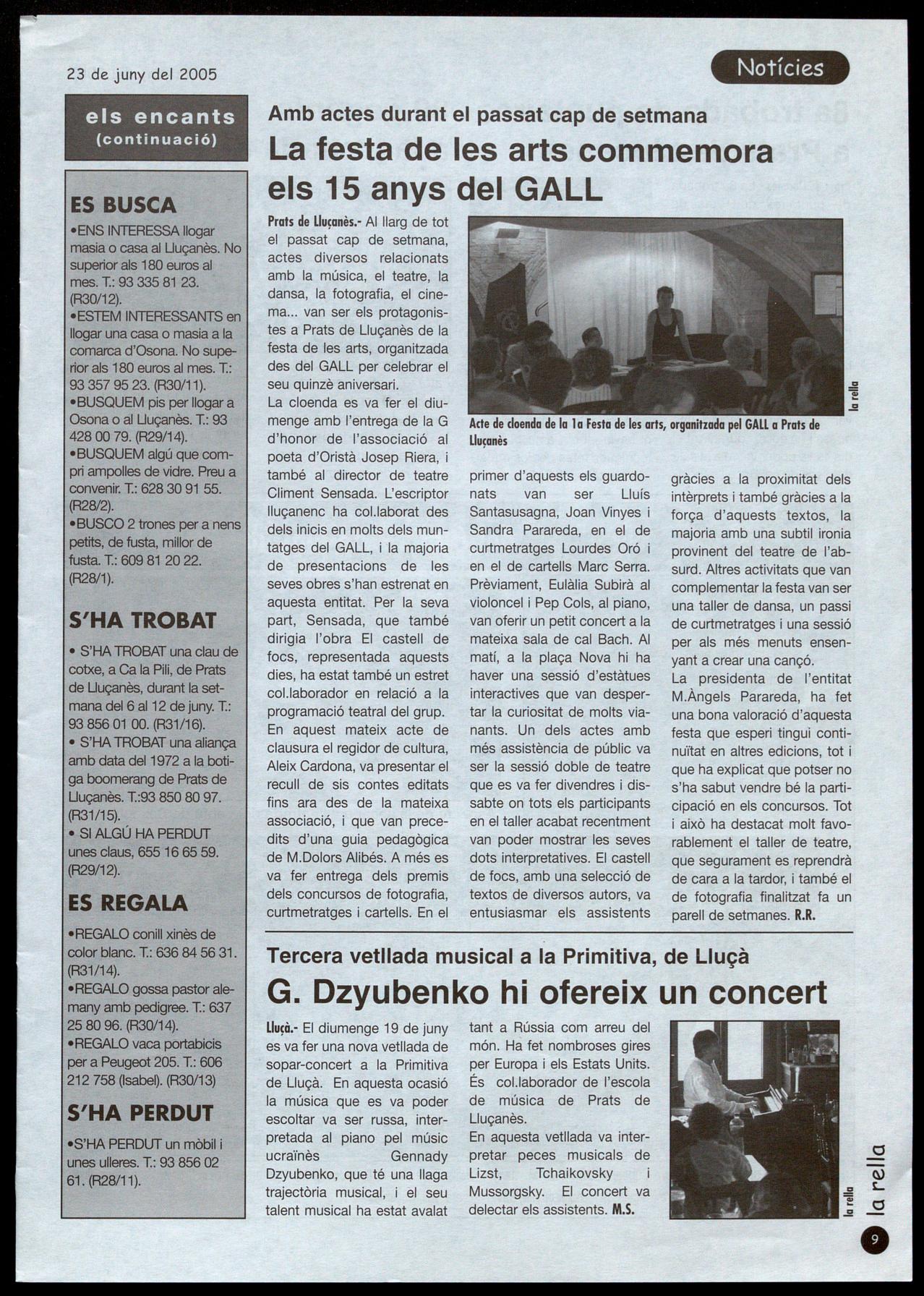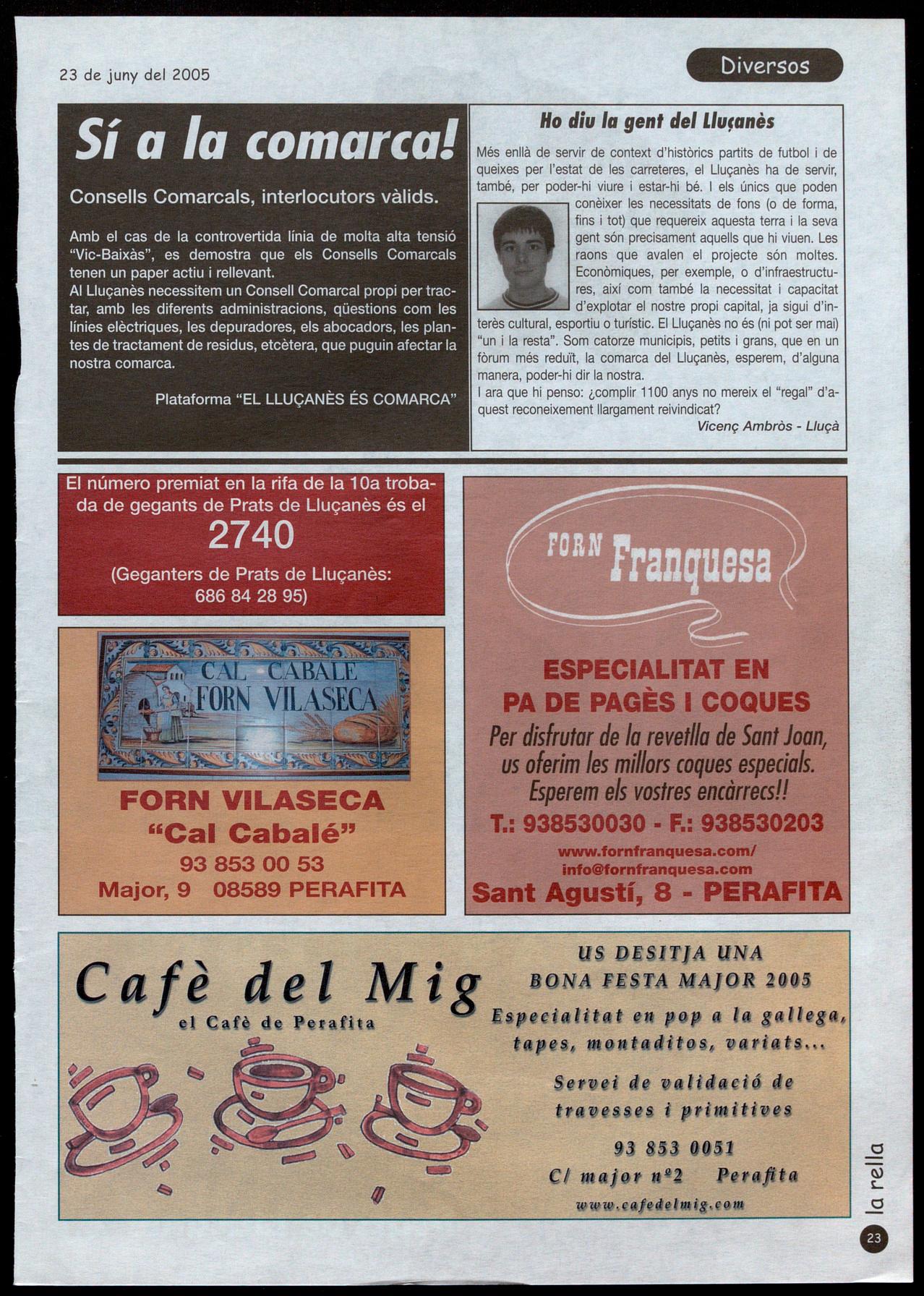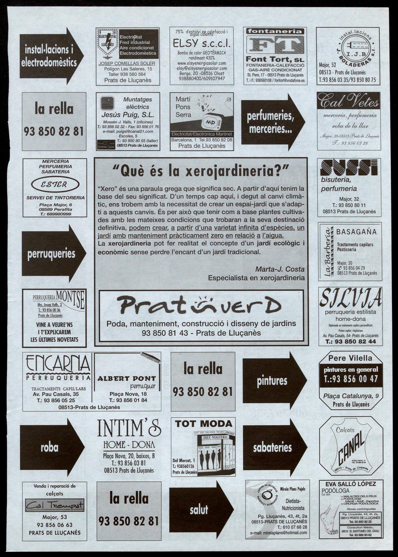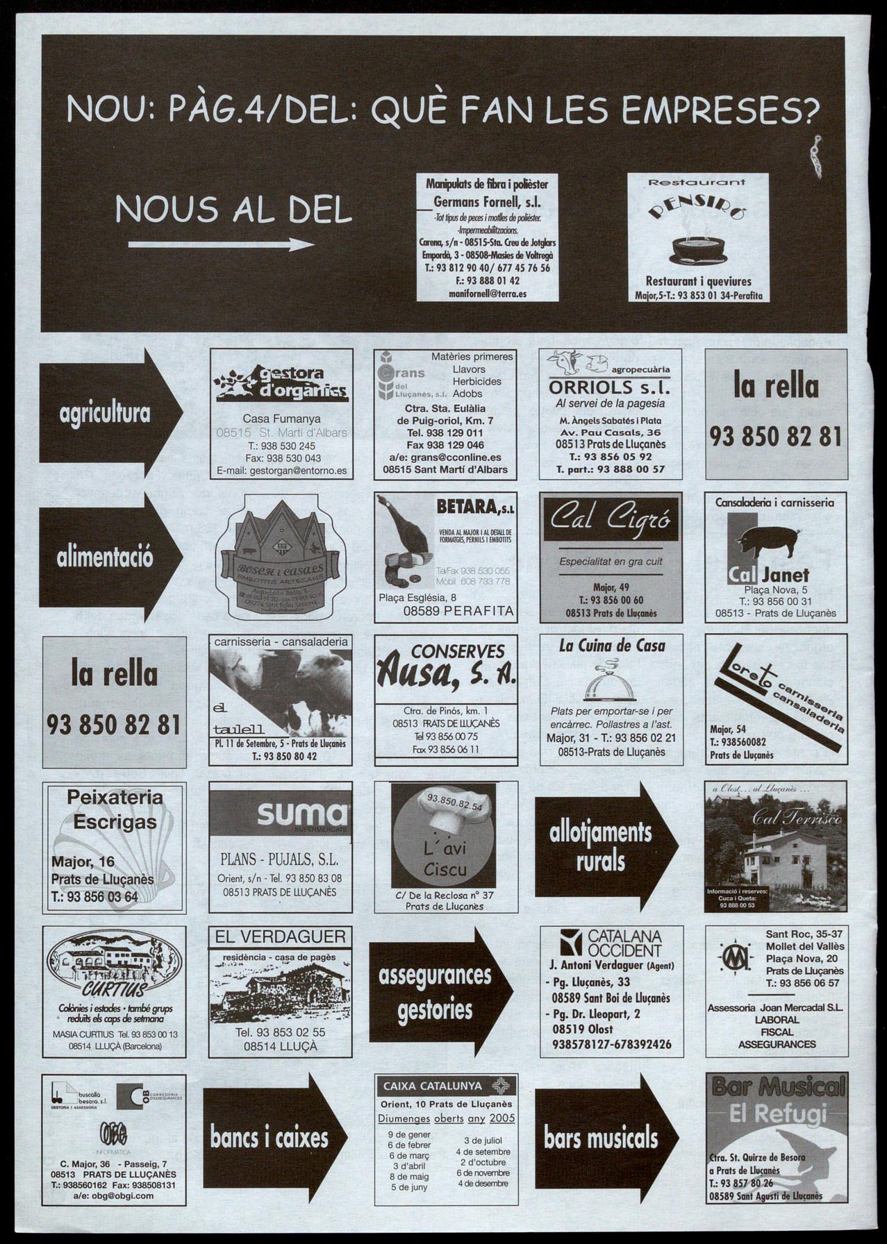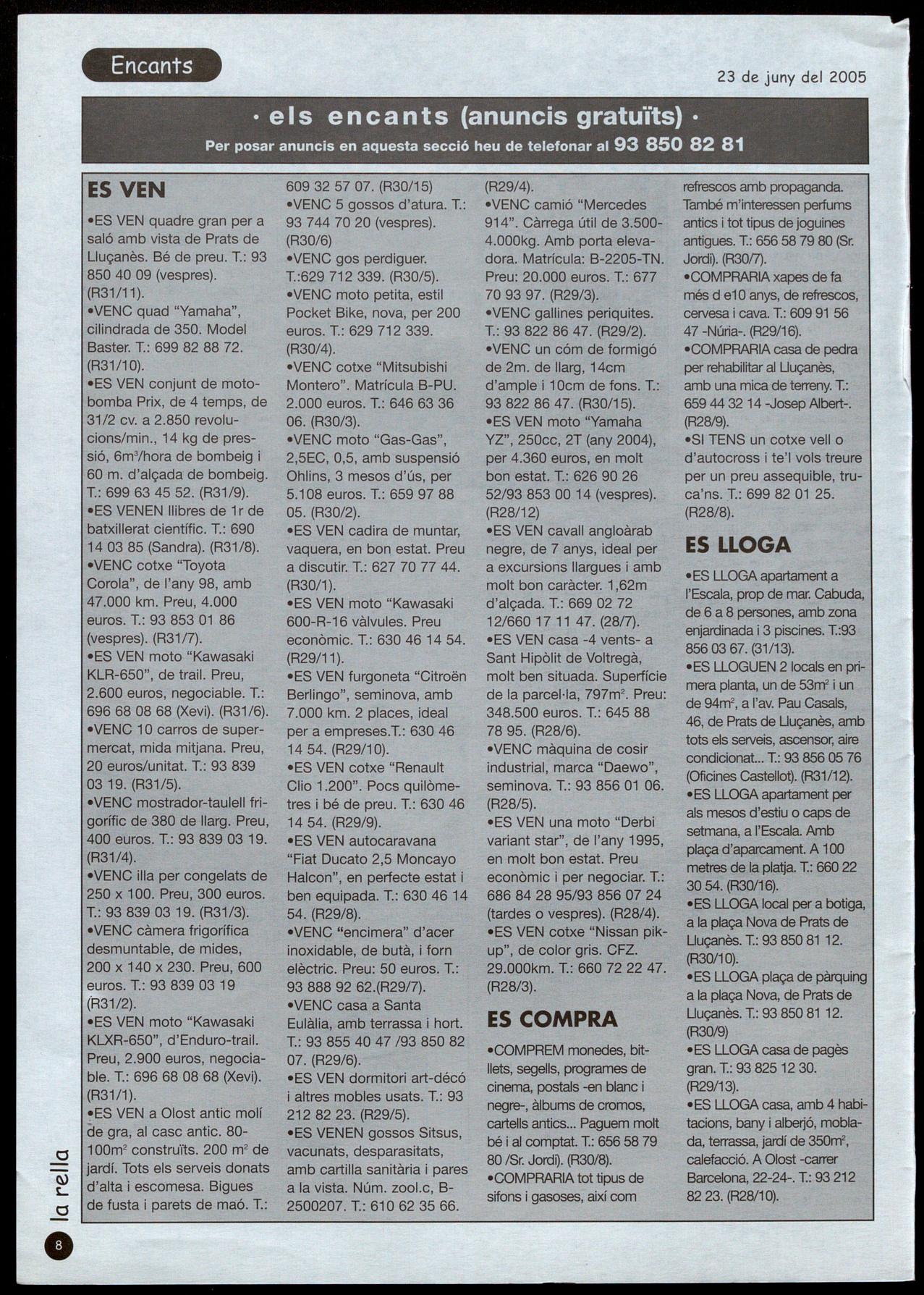 Profs de L1uçanès.- Diumenge passat, dia 19 de juny, Prats de Lluçanès va tornar a acollir un gran concurs comarcal d'ocells, que com cada any reuneix multitud d'aus al capdevall del Passeig. Enguany van ser cinc-cents els ocells participants provinents de tot Catalunya, sobretot, però, del Lluçanès i de les comarques veïnes d'Osona, Bages Berguedà. D'un total de 105 pinsans participants, va guanyar el vigatà Mohamed Hachmi, el pinsà del qual va refilar 381 vegades. De ver-durns n'hi havia 110, el primer lloc se'l va emportar Francisco Férnandez, de Torelló, amb 505 refilades. Pel que fa a les caderneres, la que va refilar més de les 191