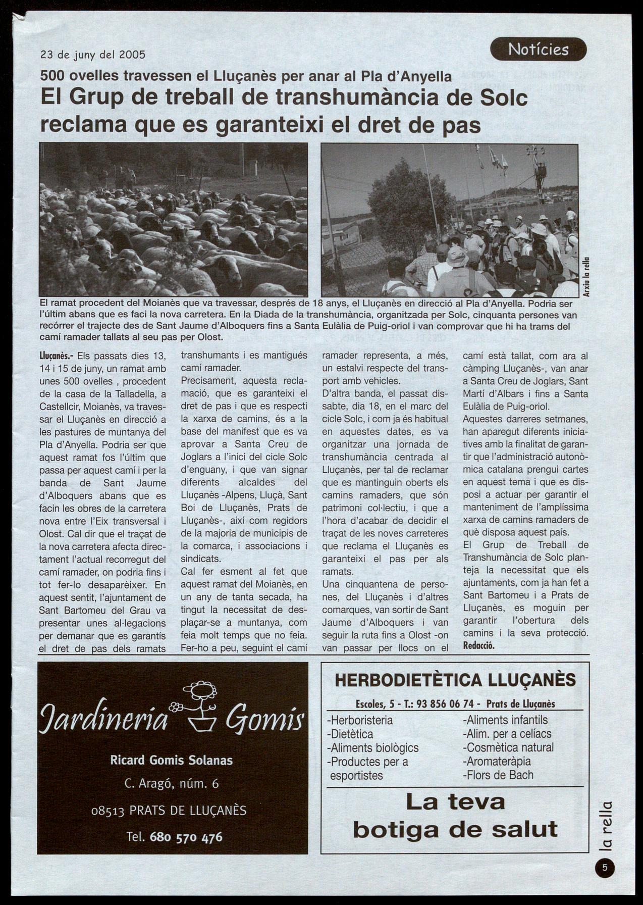 camí està tallat, com ara al càmping Lluçanès-, van anar a Santa Creu de Joglars, Sant Martí d'Albars i fins a Santa Eulàlia de Puig-oriol. Aquestes darreres setmanes, han aparegut diferents iniciatives amb la finalitat de garantir que l'administració autonòmica catalana prengui cartes en aquest tema que es disposi a actuar per garantir el manteniment de l'amplíssima xarxa de camins ramaders de què disposa aquest país. El Grup de Treball de Transhumància de Solc planteja la necessitat que els ajuntaments, com ja han fet a Sant Bartomeu a Prats de Lluçanès, es moguin per garantir l'obertura dels camins i la seva protecció. Redacció.