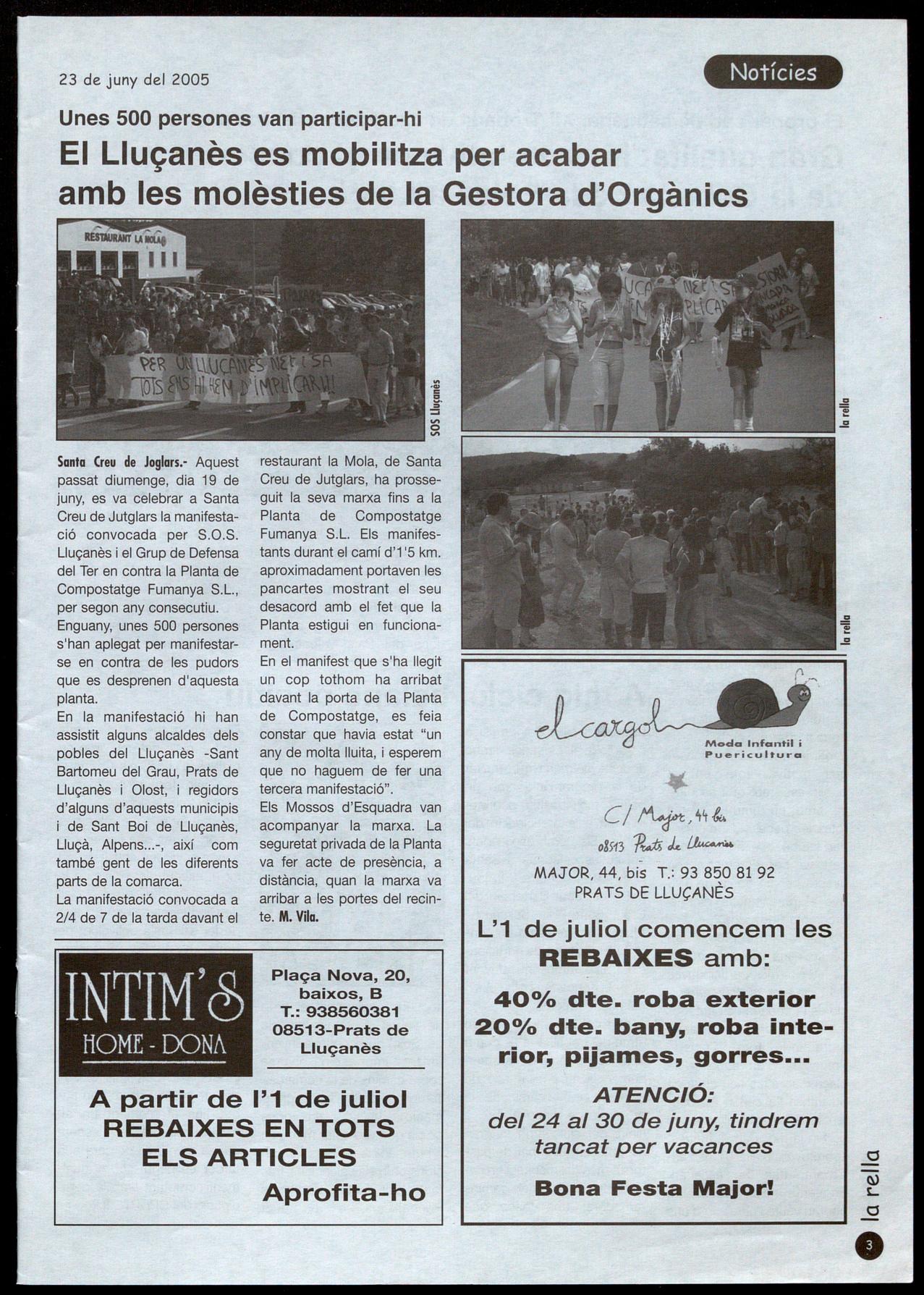 Santa (reu de Joglars.- Aquest passat diumenge, dia 19 de juny, es va celebrar a Santa Creu de Jutglars la manifestació convocada per S.O.S. Lluçanès el Grup de Defensa del Ter en contra la Planta de Compostatge Fumanya S.L., per segon any consecutiu. Enguany, unes 500 persones s'han aplegat per manifestarse en contra de les pudors que es desprenen d'aquesta planta.