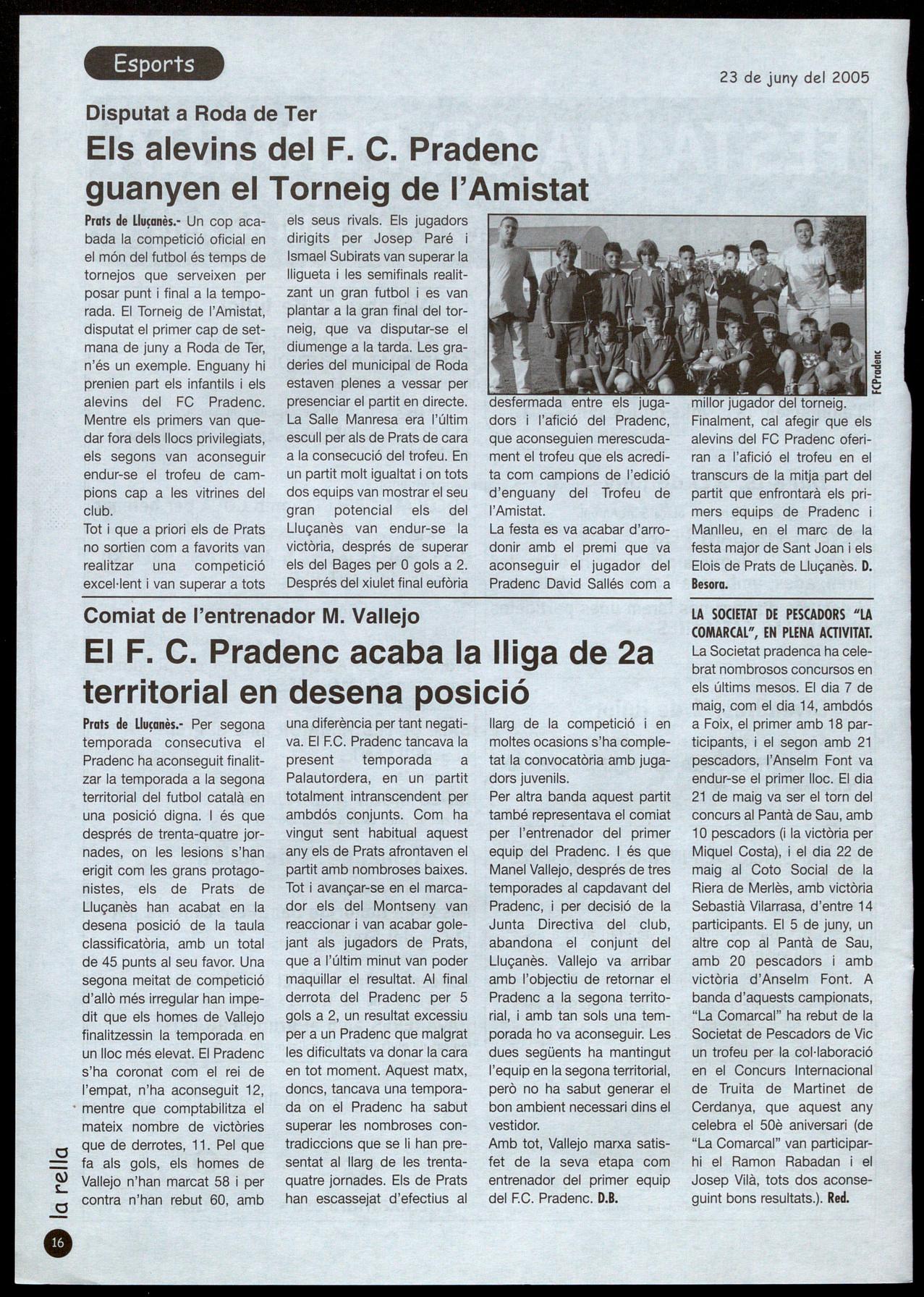Prats de Lluçanès.- Un cop acabada la competició oficial en el món del futbol és temps de tornejos que serveixen per posar punt i final a la temporada. El Torneig de l'Amistat, disputat el primer cap de setmana de juny a Roda de Ter, n'és un exemple. Enguany hi prenien part els infantils i els alevins del FC Pradenc. Mentre els primers van quedar fora dels llocs privilegiats, els segons van aconseguir endur-se el trofeu de campions cap a les vitrines del club.