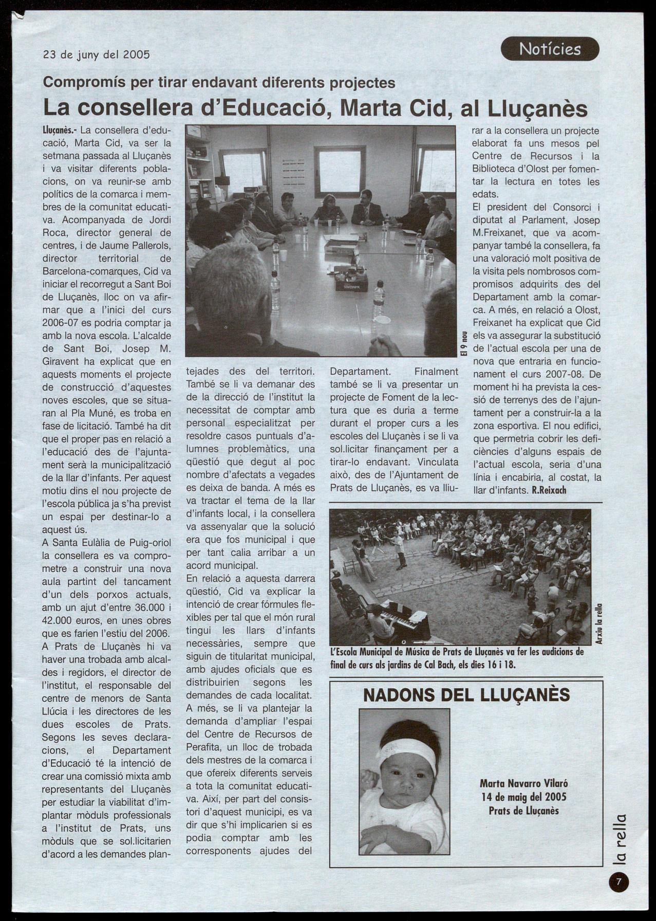 L1usanès.- La consellera d'educació, Marta Cid, va ser la setmana passada al Lluçanès i va visitar diferents poblacions, on va reunir-se amb polítics de la comarca i membres de la comunitat educativa. Acompanyada de Jordi Roca, director general de centres, i de Jaume Pallerols, director territorial de Barcelona-comarques, Cid va iniciar el recorregut a Sant Boi de Lluçanès, lloc on va afirmar que a l'inici del curs 2006-07 es podria comptar ja amb la nova escola. L'alcalde de Sant Boi, Josep M. Giravent ha explicat que en aquests moments el projecte de construcció d'aquestes noves escoles, que se situaran al Pla Muné, es troba en fase de licitació. També ha dit que el proper pas en relació a l'educació des de l'ajuntament serà la municipalització de la llar d'infants. Per aquest motiu dins el nou projecte de l'escola pública ja s'ha previst un espai per destinar-lo a aquest ús.