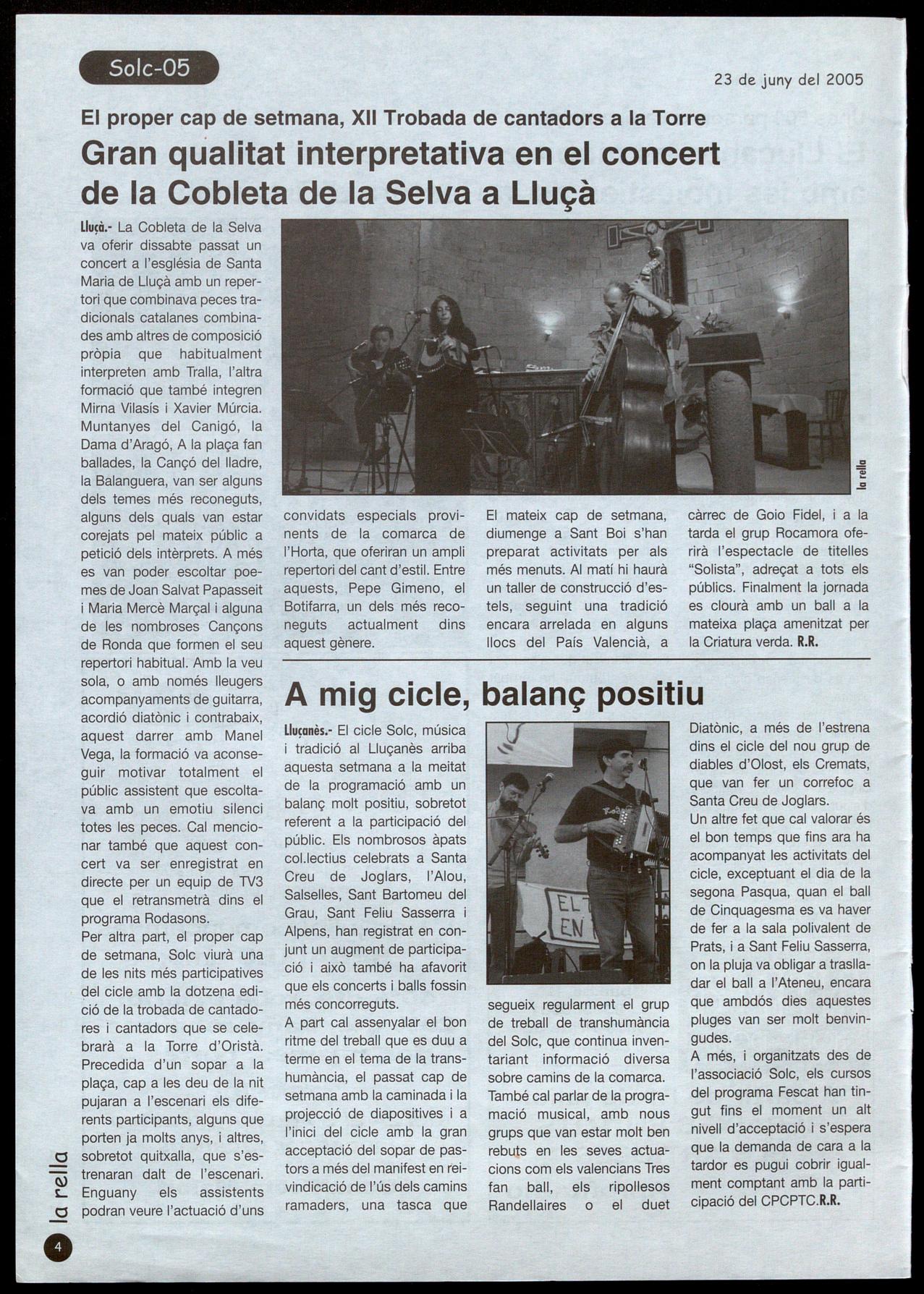 Lluçanès.· El cicle Solc, música i tradició al Lluçanès arriba aquesta setmana a la meitat de la programació amb un balanç molt positiu, sobretot referent a la participació del públic. Els nombrosos àpats col.lectius celebrats a Santa Creu de Joglars, l'Alou, Salselles, Sant Bartomeu del Grau, Sant Feliu Sasserra i Alpens, han registrat en conjunt un augment de participació això també ha afavorit que els concerts i balls fossin més concorreguts.