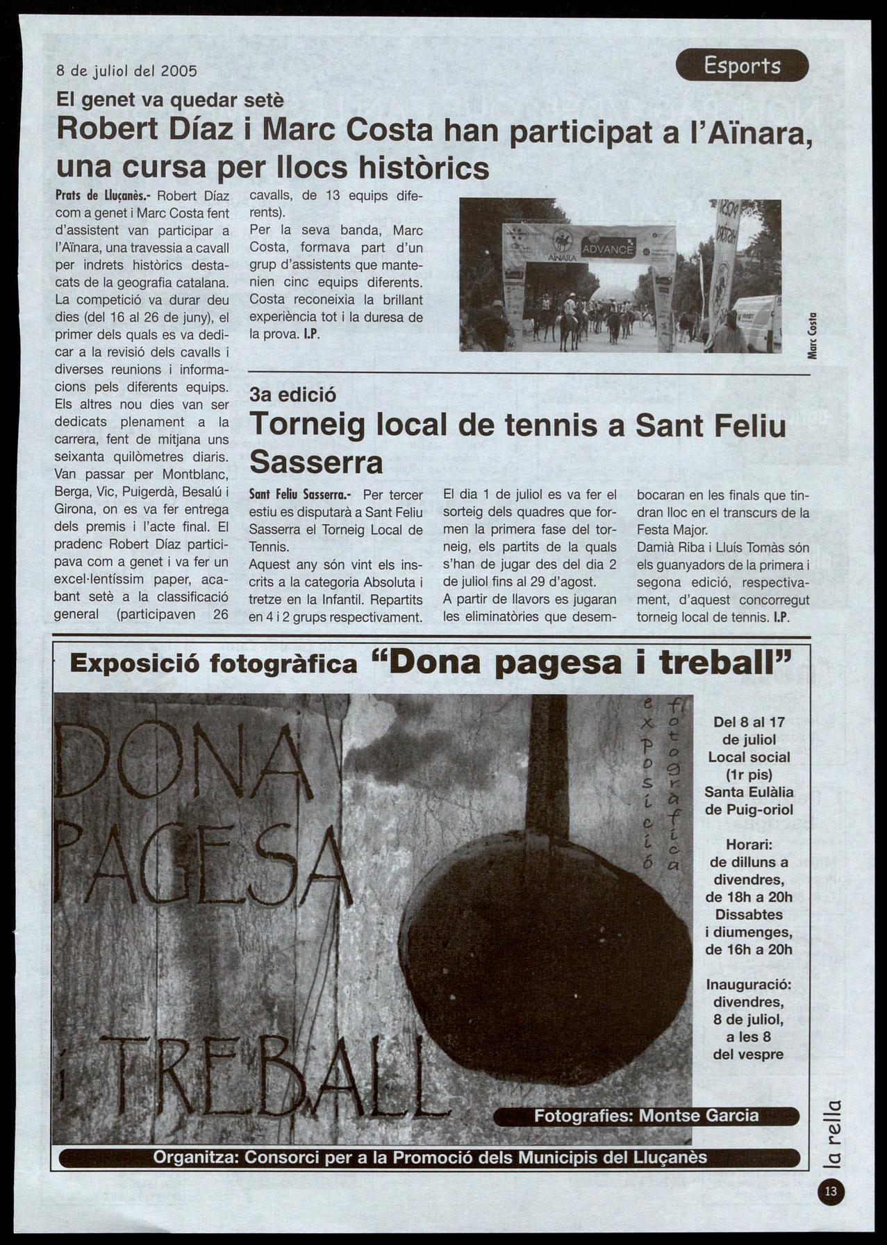 Prats de Lluçanès.- Robert Díaz com a genet Marc Costa fent d'assistent van participar a l'Aïnara, una travessia a cavall per indrets històrics destacats de la geografia catalana. La competició va durar deu dies (del 16 al 26 de juny), el primer deis quals es va dedicar a la revisió dels cavalls diverses reunions informacions pels diferents equips. Els altres nou dies van ser dedicats plenament a la carrera, fent de mitjana uns seixanta quilòmetres diaris.