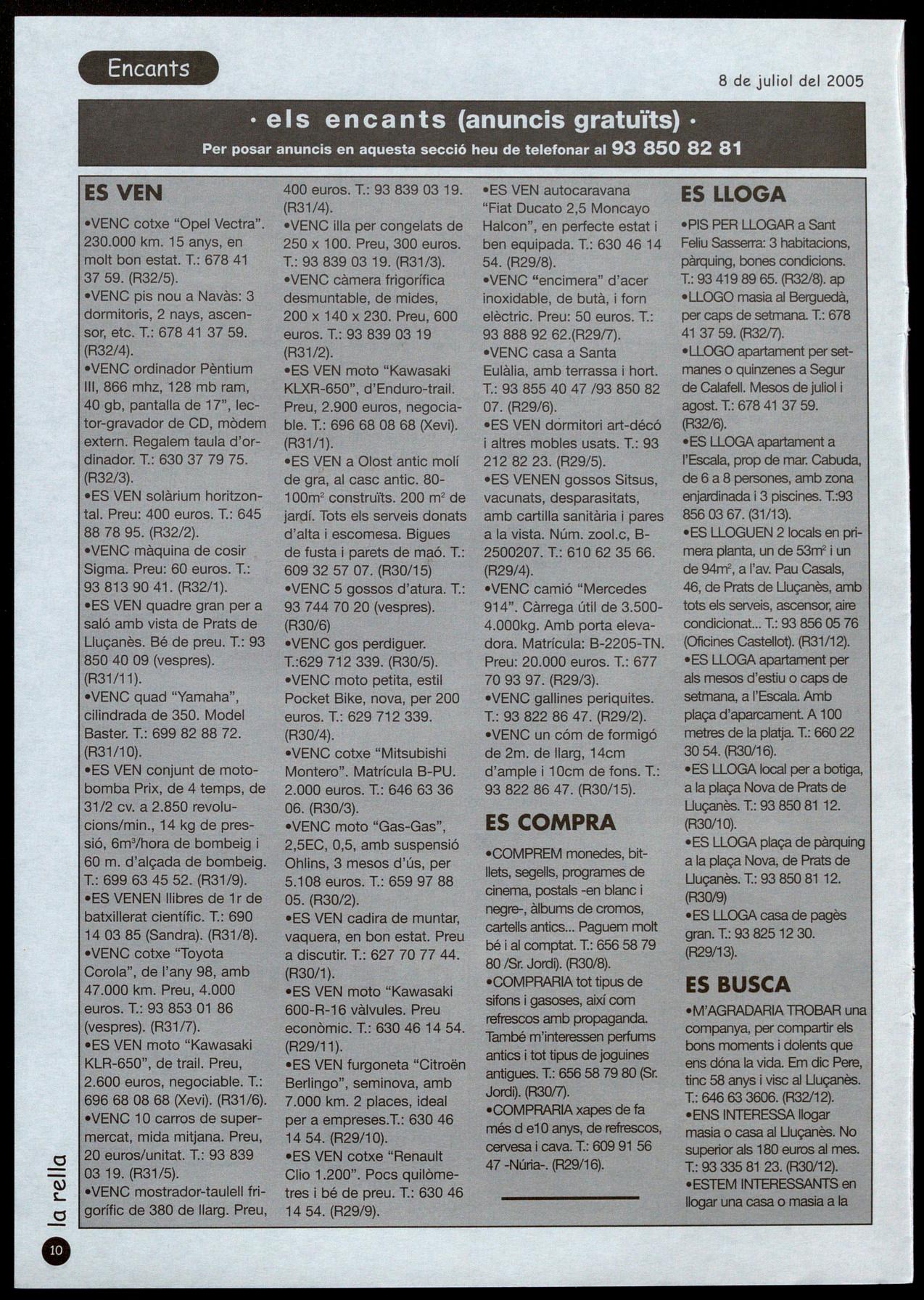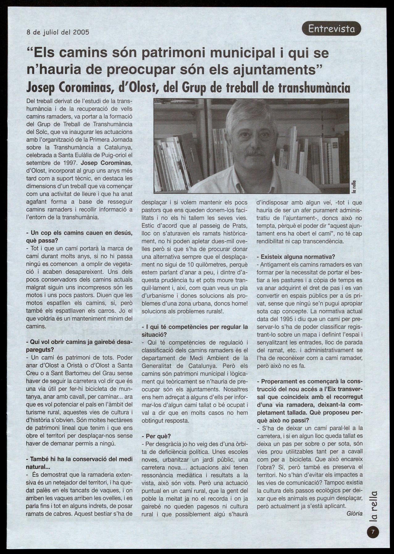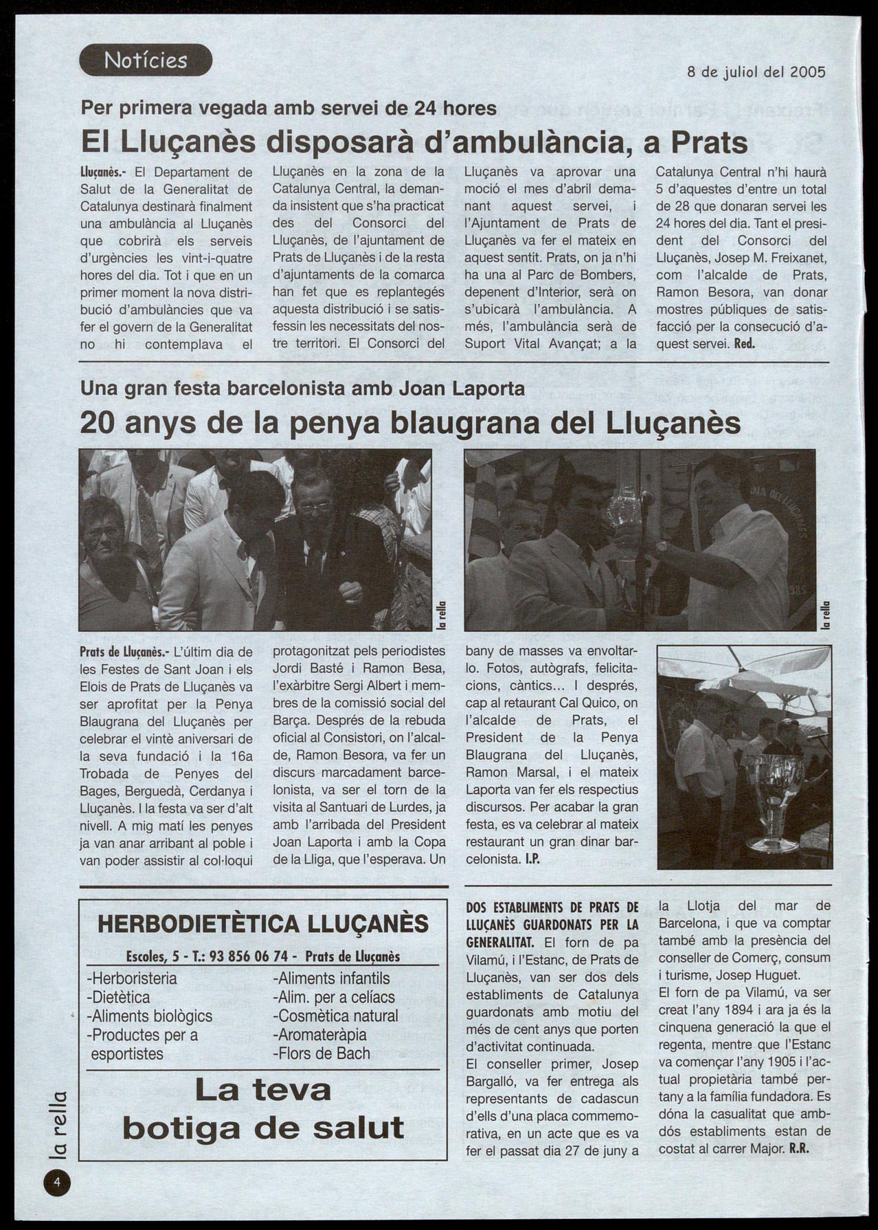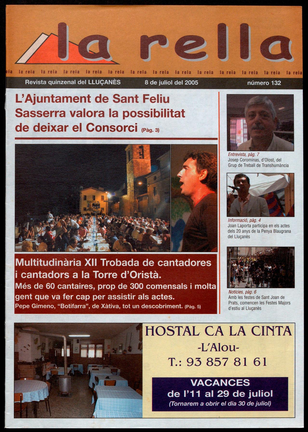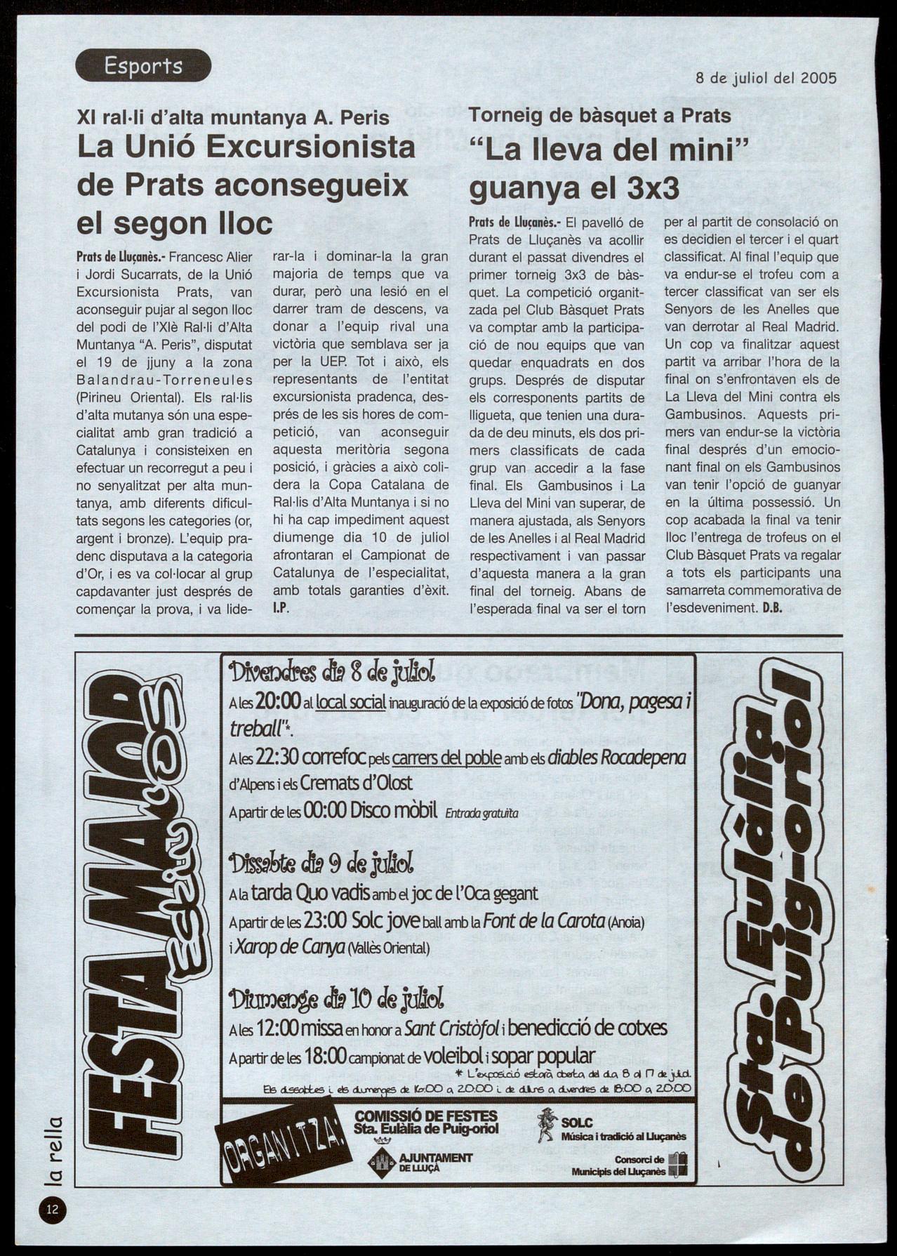 8 de juliol del 2005 pel poble, amb la participació de bestiar, sobretot la del dia 25, amb nombrosos carros i carruatges, van ser molt vistoses participatives, i com a novetat d'enguany, a les places es va llegir un comunicat redactat per diferents entitats del poble per informar sobre la festa el ball del contrapàs. Com l'any anterior, també hi havia els espais joves, a la sala polivalent i al camp de futbol, i a part cal remarcar el castell de focs, el ball de gala, les havaneres, les curses dels elois, les sardanes i el concert amb el grup orquestral Diaula. També en el transcurs de les festes es van elegir per votació popular la pubilla l'hereu de la vila, càrrecs que van recaure respectivament en Isabel Ballús i Abel Peraire. A més, durant tots aquests dies es van poder visitar diferents exposicions: del pintor local Jaume Sangrà, de fotografies de pastors, de Montse Rocadembosch, de cartells del concurs escolar. R.R.
