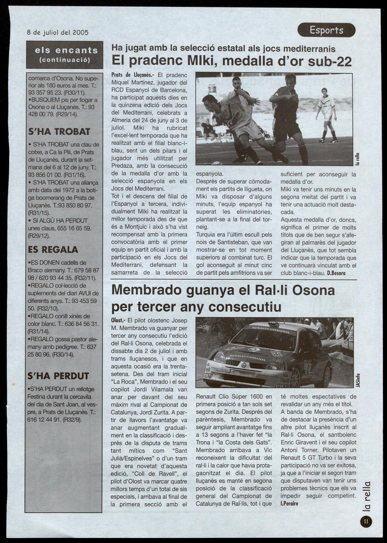 Prats de Llu�anès.- El pradenc Miquel Martínez, jugador del RCD Espanyol de Barcelona, ha participat aquests dies en la quinzena edició dels Jocs del Mediterrani, celebrats a Almeria del 24 de juny al 3 de juliol. Miki ha rubricat I'excel·lent temporada que ha realitzat amb el filial blanc-iblau, sent un dels pilars el jugador més utilitzat per Predaza, amb la consecució de la medalla d'or amb la selecció espanyola en els Jocs del Mediterrani.