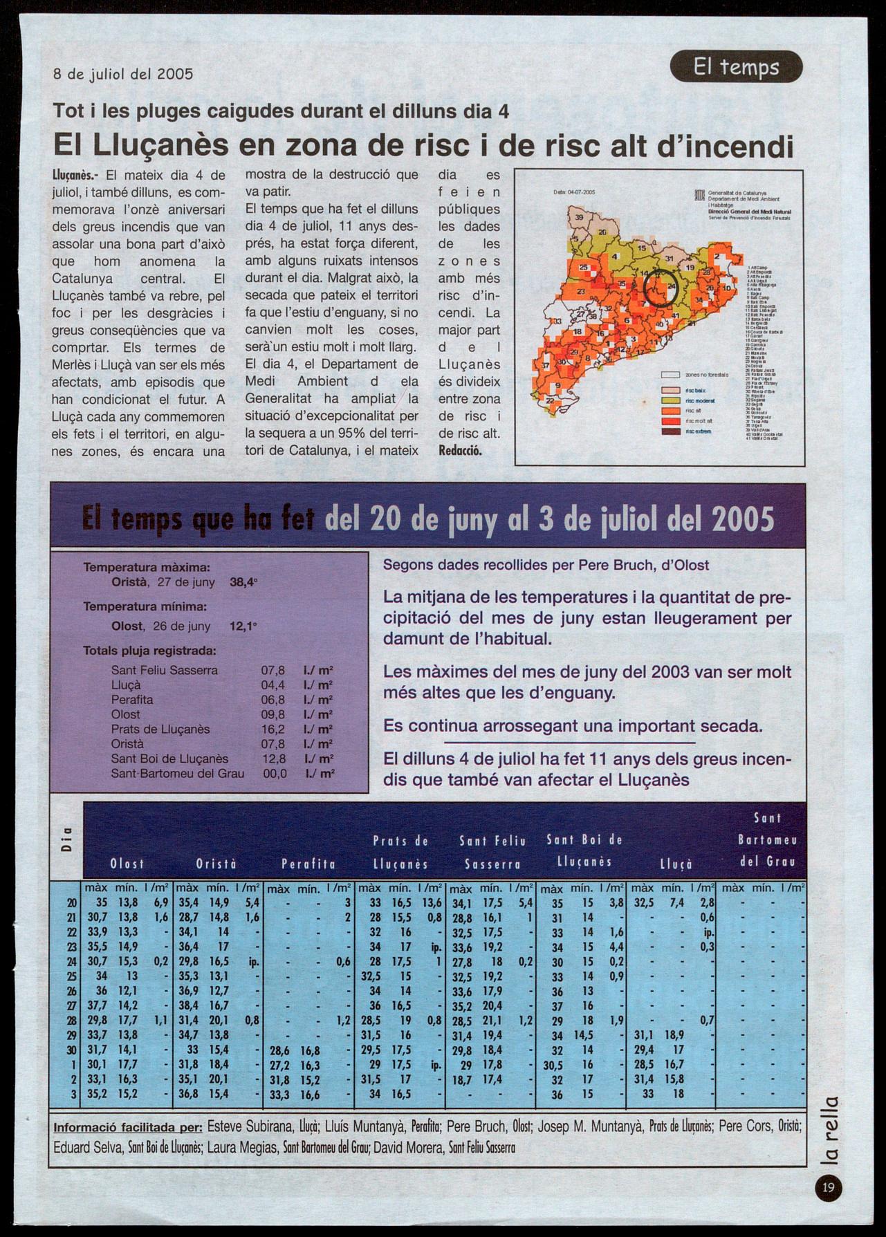 mostra de la destrucció que va patir. El temps que ha fet el dilluns dia 4 de juliol, 11 anys després, ha estat força diferent, amb alguns ruixats intensos durant el dia. Malgrat això, la secada que pateix el territori fa que l'estiu d'enguany, si no canvien molt les coses, serà'un estiu molt i molt llarg. El dia 4, el Departament de Medi Ambient deia Generalitat ha amPliaylla situació d'excepcionalitat per la sequera a un 95% del territori de Catalunya, el mateix