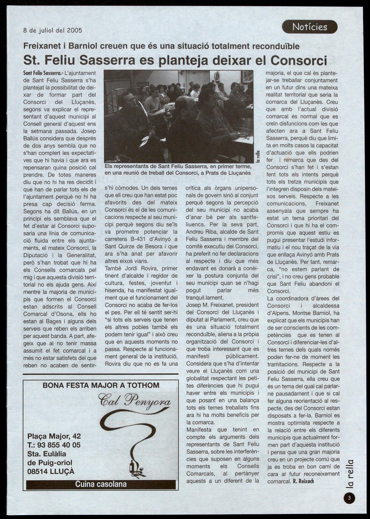 L'Ajuntament de Sant Feliu Sasserra valora la possibilitat de deixar el Consorci (Pàg.3)