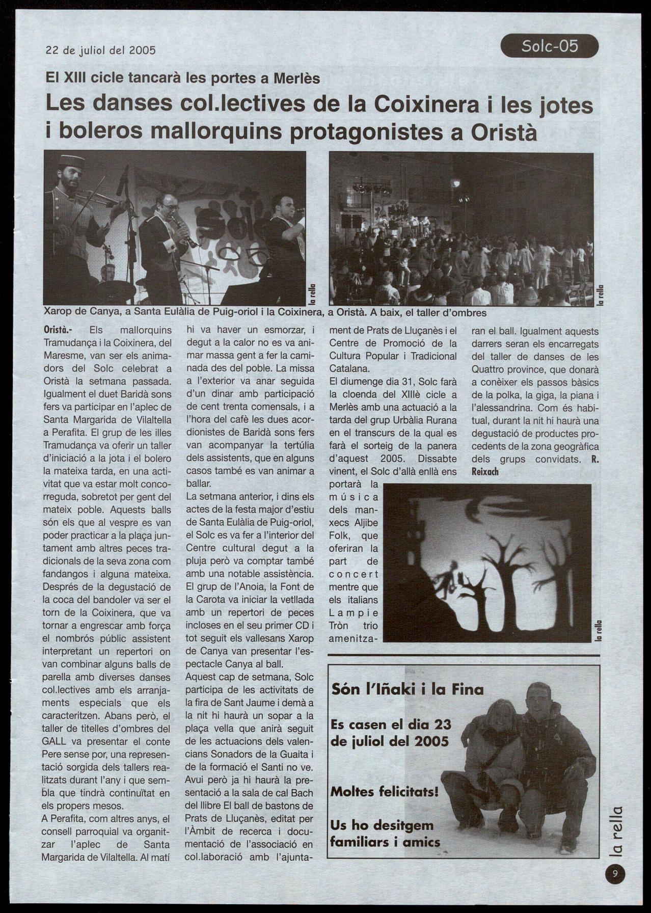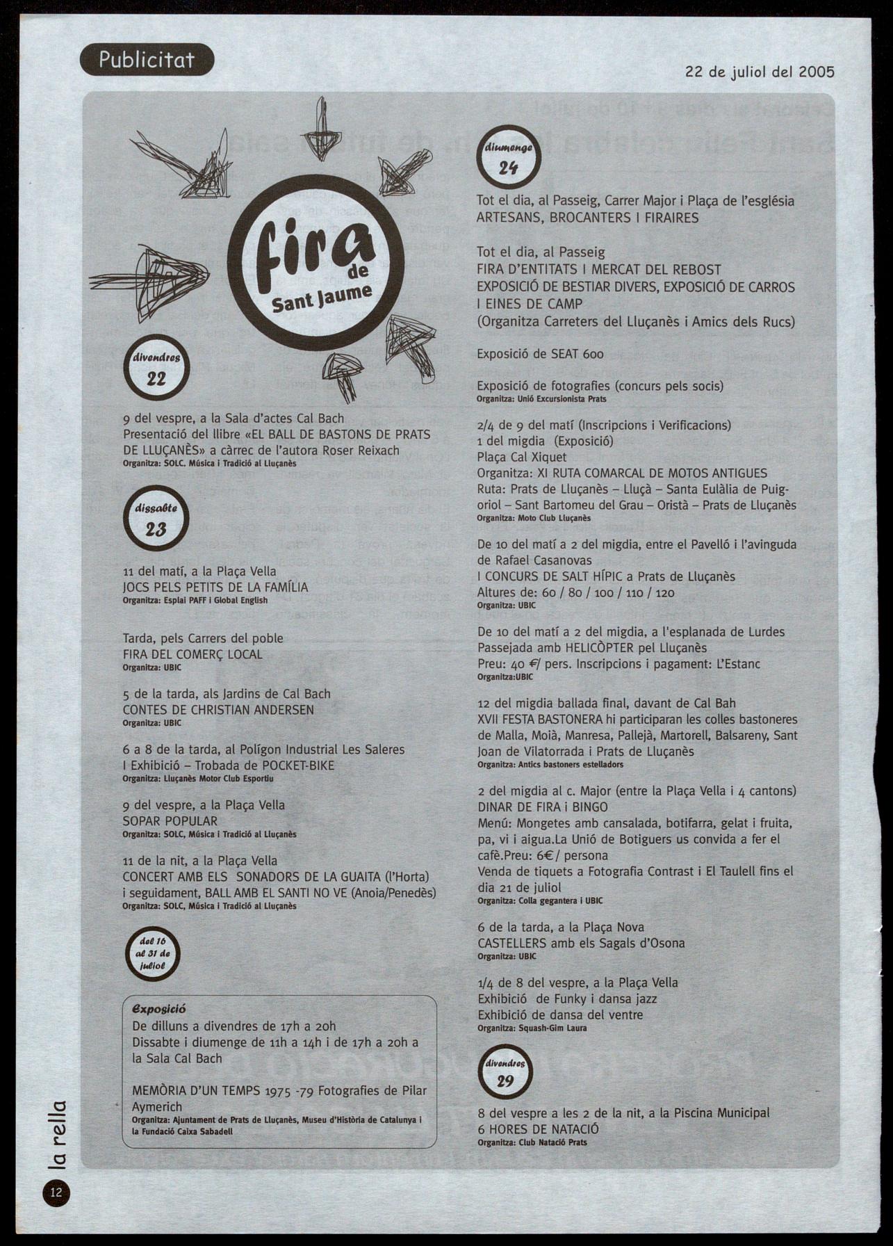 FESTA MAJOR D'ESTIU A STA. EULÀLIA DE PUlG·ORIOL El segon cap de setmana de juliol es va celebrar la festa major d'estiu a Sta. Eulàlia de Puig-oriol. La pluja va acompanayr algunes de les activitats que es van encetar el divendres amb la inauguració de l'exposició de fotos "Dona, pagesa treball".