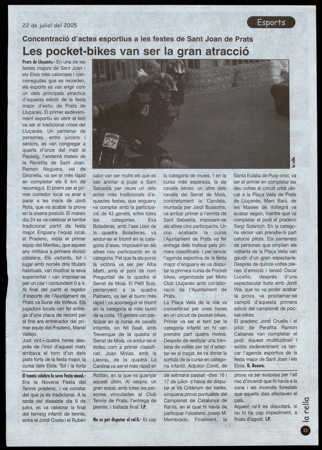 La Plaça Vella de la vila va convertir-se per unes hores en un circuit de pocket-bikes. Primer va ser el torn per la categoria infantil on hi van prendre part quatre motos. Després de realitzar una trentena de voltes per tal d'adaptar-se al traçat, es va donar la sortida de la cursa en categoria infantil. Adjutori Conill, de Rotllan, en la que va guanyar aquest últim. AI vespre, un gran sopar, amb totes les persones vinculades al Club Tennis de Prats, l'entrega de premis, ballada final. I.P.