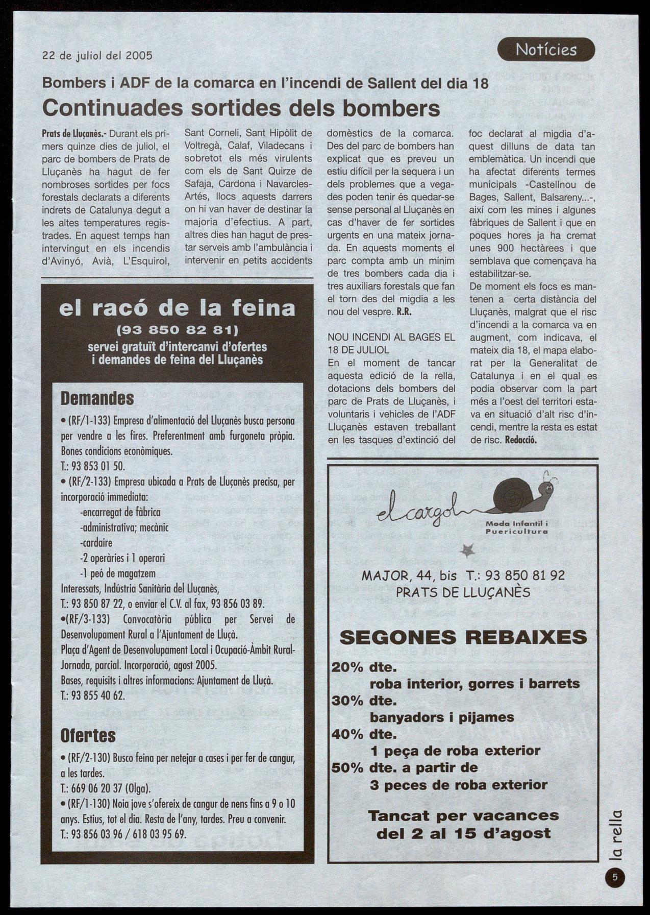 Prats de Llu�anès.- Durant els primers quinze dies de juliol, el pare de bombers de Prats de Lluçanès ha hagut de fer nombroses sortides per focs forestals declarats a diferents indrets de Catalunya degut a les altes temperatures registrades. En aquest temps han intervingut en els incendis d'Avinyó, Avià, L'Esquirol,