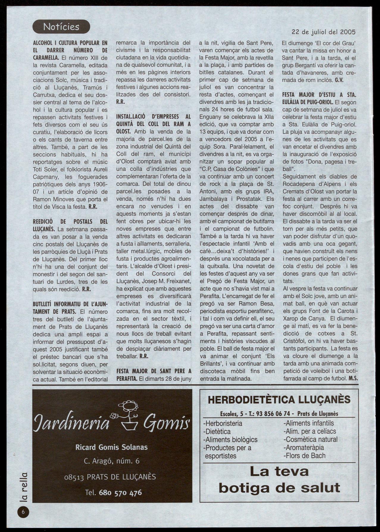 ALCOHOL I CULTURA POPULAR EN EL DARRER NÚMERO DE CARAMELLA. El número XIII de la revista Caramella, editada conjuntament per les associacions Solc, música i tradició al Lluçanès, Tramús Carrutxa, dedica el seu dossier central al tema de l'alcohol la cultura popular i es repassen activitats festives fets diversos com el seu ús curatiu, l'elaboració de licors o els cants de taverna entre altres. També, a part de les seccions habituals, hi ha reportatges sobre el músic Toti Soler, el folklorista Aureli. Capmany, les foguerades patriòtiques dels anys 190607 i un article d'opinió de Ramon Minoves que porta el títol de Visca la festa. R.R.