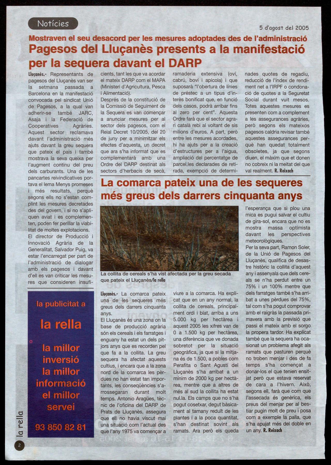 Per la seva part, Ramon Soler, de la Unió de Pagesos del Lluçanès, qualifica de desastre històric la collita d'aquest any i assenyala que dels cereals se n'ha perdut entre un 75% un 100% mentre que dels farratges també s'ha arribat a unes pèrdues del 75%, tal com s'ha pogut comprovar amb el raigràs la passada primavera amb la previsió que passi el mateix amb el sorgo la propera tardor. Ha explicat també que la sequera ha ocasionat un problema afegit als ramats que pasturen perquè no troben menjar i des de fa temps s'ha començat a donar-los el que tenien ensitjat per.ò què estava reservat dé cara a l'hivern. Això; seqons ell, farà que com que l'assecada és genèrica, els preus del, menjar per al bestiar pugin molt de preu posa com a exemple la palla, que s'ha apujat més del doble en un any. k. Reixach