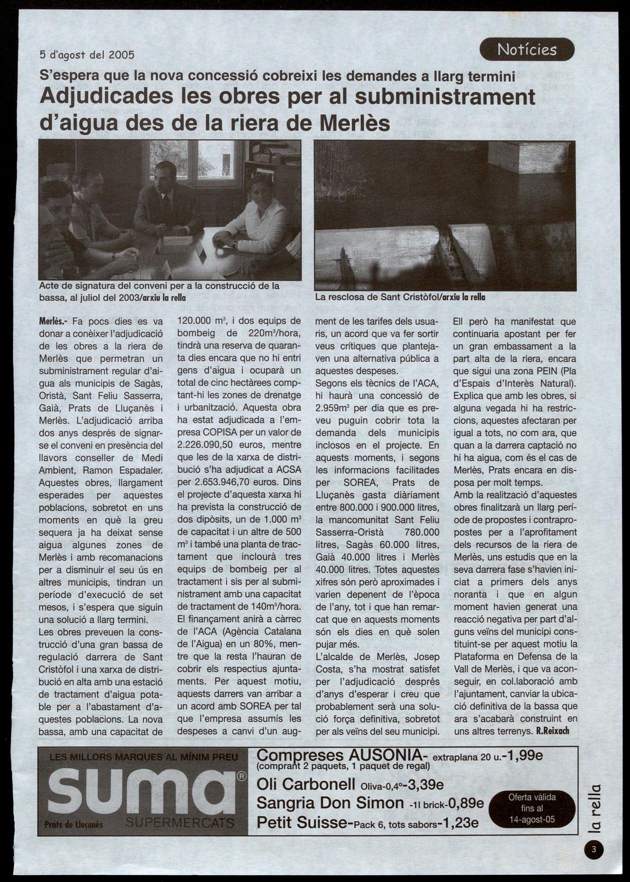 Merlès. L'adjudicació arriba dos anys després de signarse el conveni en presència del llavors conseller de Medi Ambient, Ramon Espadaler.
