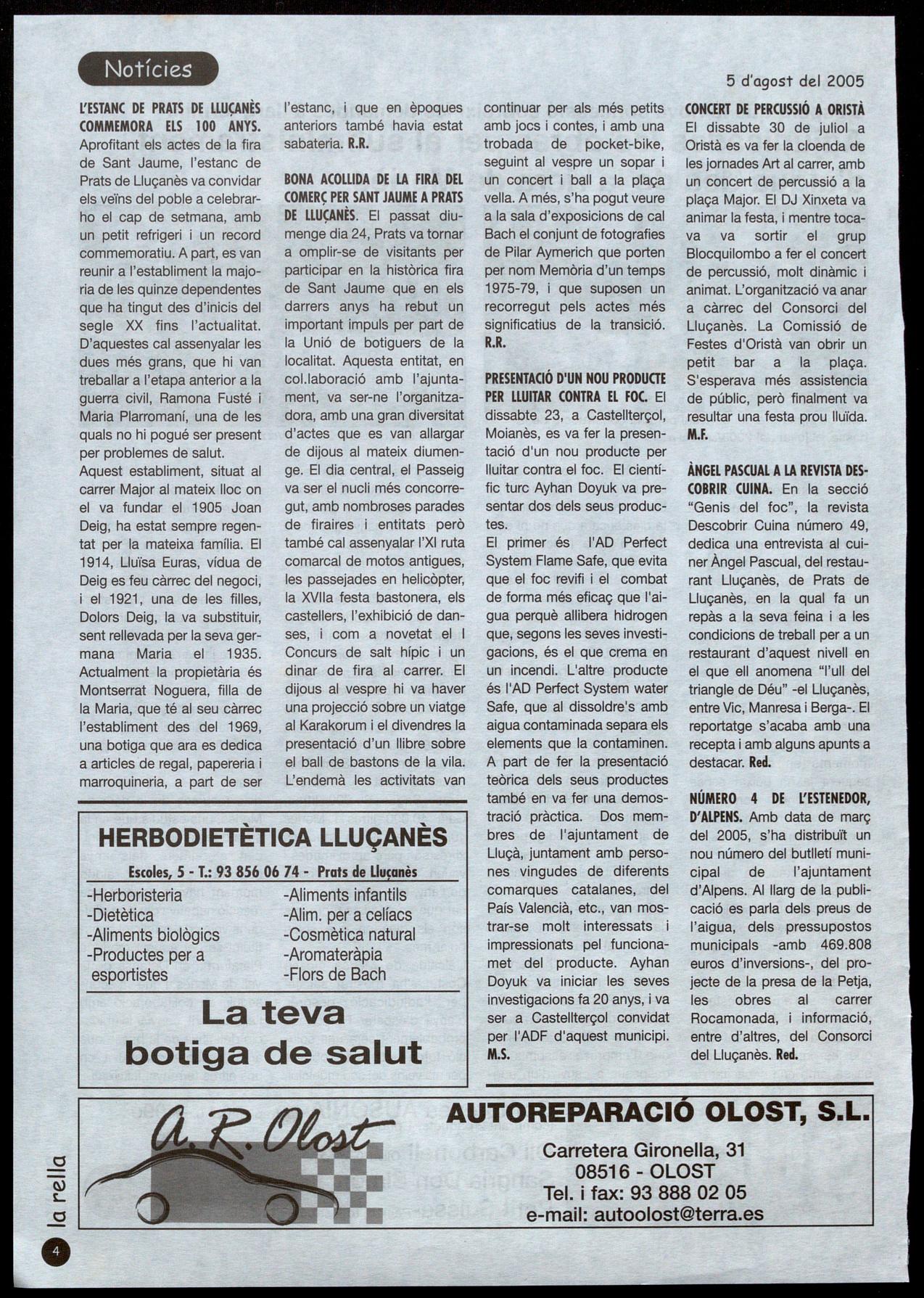 NÚMERO 4 DE L'ESTENEDOR, D'ALPENS. Amb data de març del 2005, s'ha distribuït un nou número del butlletí municipal de l'ajuntament d'Alpens. AI llarg de la publicació es parla dels preus de l'aigua, dels pressupostos municipals -arnb 469.808 euros d'inversions-, del projecte de la presa de la Petja, les obres al carrer Rocamonada, informació, entre d'altres, del Consorci del Lluçanès. Red.
