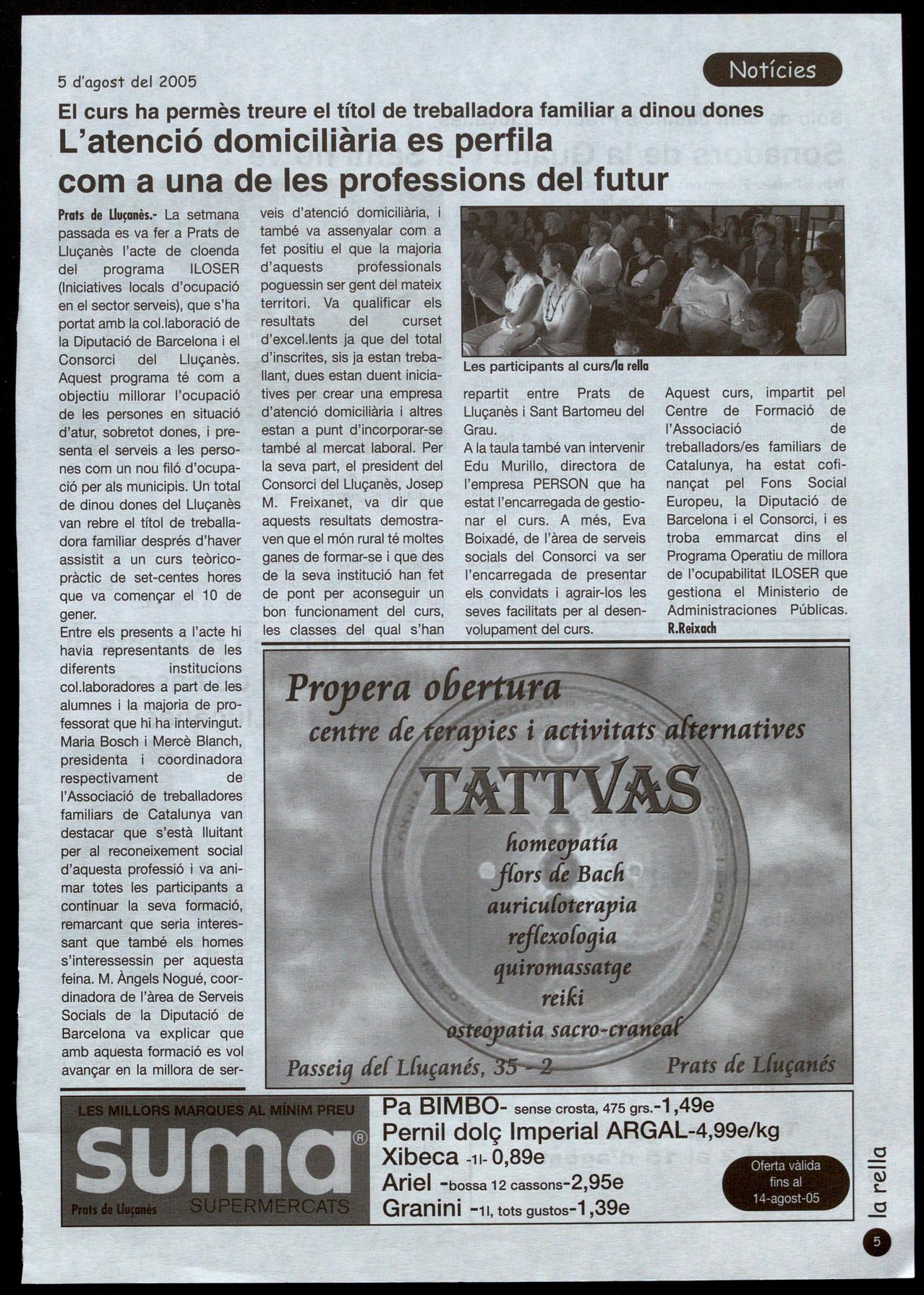veis d'atenció domiciliària, també va assenyalar com a fet positiu el que la majoria d'aquests professionals poguessin ser gent del mateix territori. Va qualificar els resultats del curset d'excel.ients ja que del total d'inscrites, sis ja estan treballant, dues estan duent iniciatives per crear una empresa d'atenció domiciliària i altres estan a punt d'incorporar-se també al mercat laboral. Per la seva part, el president del Consorci del Lluçanès, Josep M. Freixanet, va dir que aquests resultats demostraven que el món rural té moltes ganes de formar-se i que des de la seva institució han fet de pont per aconseguir un bon funcionament del curs, les classes del qual s'han