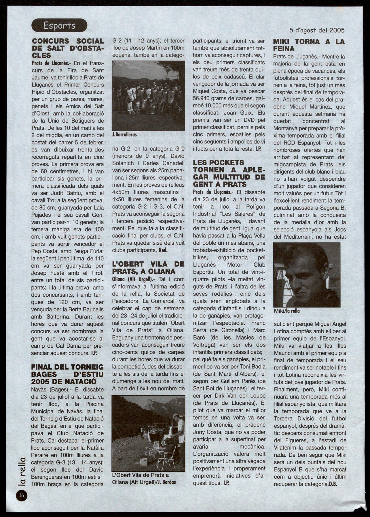 BAGES D'ESTIU 2005 DE NATACiÓ Navàs (Bages).- El dissabte dia 23 de juliol a la tarda va tenir lloc, a la Piscina Municipal de Navàs, la final del Torneig d'Estiu de Natació del Bages, en el que participava el Club Natació de Prats. Cal destacar el-primer lloc aconseguit per la Natàlia Peraire en 100m lliures a la categoria G-3 (13 14 anys); el segon lloc del David Berengueras en 1 DOm estils i 1 DOm braça en la categoria