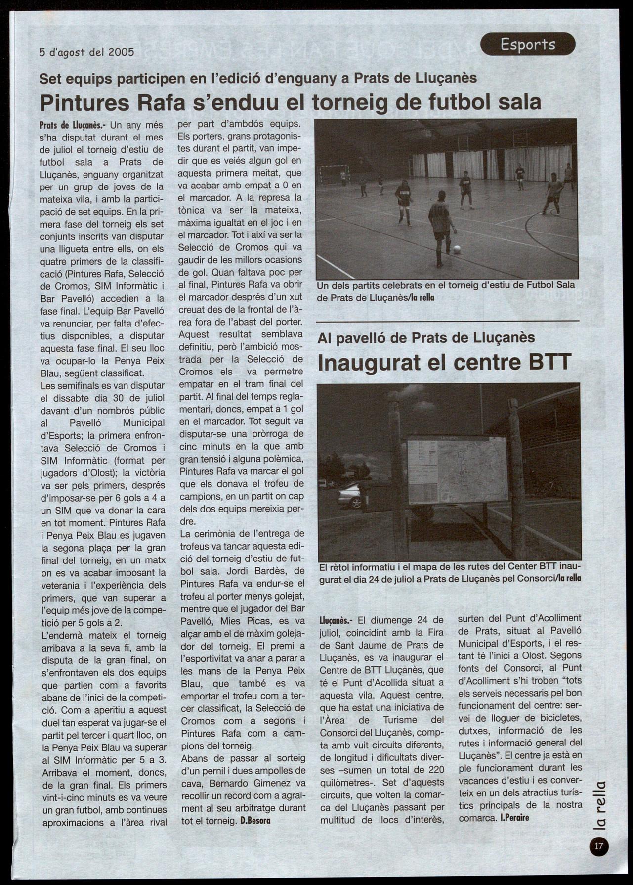 Prals de Llu�anès.· Un any més s'ha disputat durant el mes de juliol el torneig d'estiu de futbol sala a Prats de Lluçanès, enguany organitzat per un grup de joves de la mateixa vila, amb la partielpació de set equips. En la primera fase del torneig els set conjunts inscrits van disputar una lligueta entre ells, on els quatre primers de la classlñcació (Pintures Rafa, Selecció de Cromos, SIM Informàtic Bar Pavelló) accedien a la fase final. L'equip Bar Pavelló va renunciar, per falta d'efectius disponibles, a disputar aquesta fase final. El seu lloc va ocupar-lo la Penya Peix Blau, següent classificat. Les semifinals es van disputar el dissabte dia 30 de juliol davant d'un nombrós públic al Pavelló Municipal d'Esports; la primera enfrontava Selecció de Cromos SIM Informàtic (format per jugadors d'Olost); la victòria va ser pels primers, després d'imposar-se per 6 gols a 4 a un SIM que va donar la carà en tot moment. Pintures Rafa i Penya Peix Blau es jugaven la segona plaça per la gran final del torneig, en un matx on es va acabar imposant la veterania l'experiència dels primers, que van superar a l'equip més jove de la cornpetició per 5 gols a 2. L'endemà mateix el torneig arribava a la seva fi, amb la disputa de la gran.final, on s'enfrontaven els dos equips que partien com a favorits abans de l'inici de la competíció. Com a aperitiu a aquest duel tan esperat va jugar-se el partit pel tercer quart lloc, on la Penya Peix Blau va superar al SIM Informàtic per 5 a 3. Arribava el moment, doncs, de la gran final. Els primers vint-i-cinc minuts es va veure un gran futbol, amb continues aproximacions a l'àrea rival