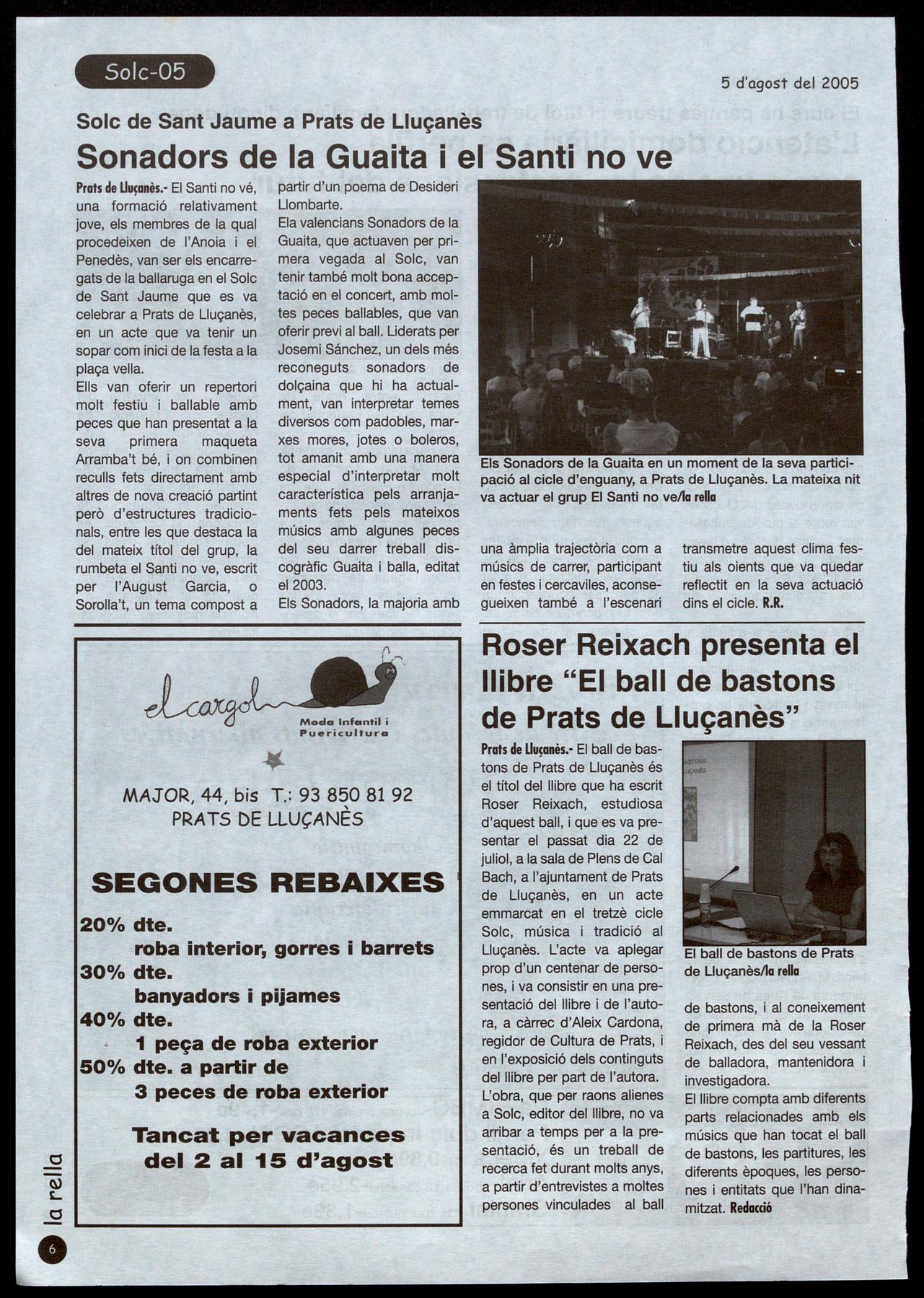 Prats de Llu�anès.- El ball de bastons de Prats de Lluçanès és el títol del llibre que ha escrit Roser Reixach, estudiosa d'aquest ball, que es va presentar el passat dia 22 de juliol, a la sala de Plens de Cal Bach, a l'ajuntament de Prats de Lluçanès, en un acte emmarcat en el tretzè cicle Solc, música tradició al Lluçanès. L'acte va aplegar prop d'un centenar de persones, va consistir en una presentació del llibre i de l'autora, a càrrec d'Aleix Cardona, regidor de Cultura de Prats, i en l'exposició dels continguts deillibre per part de l'autora. L'obra, que per raons alienes a Solc, editor del llibre, no va arribar a temps per a la presentació, és un treball de recerca fet durant molts anys, a partir d'entrevistes a moltes persones vinculades al ball