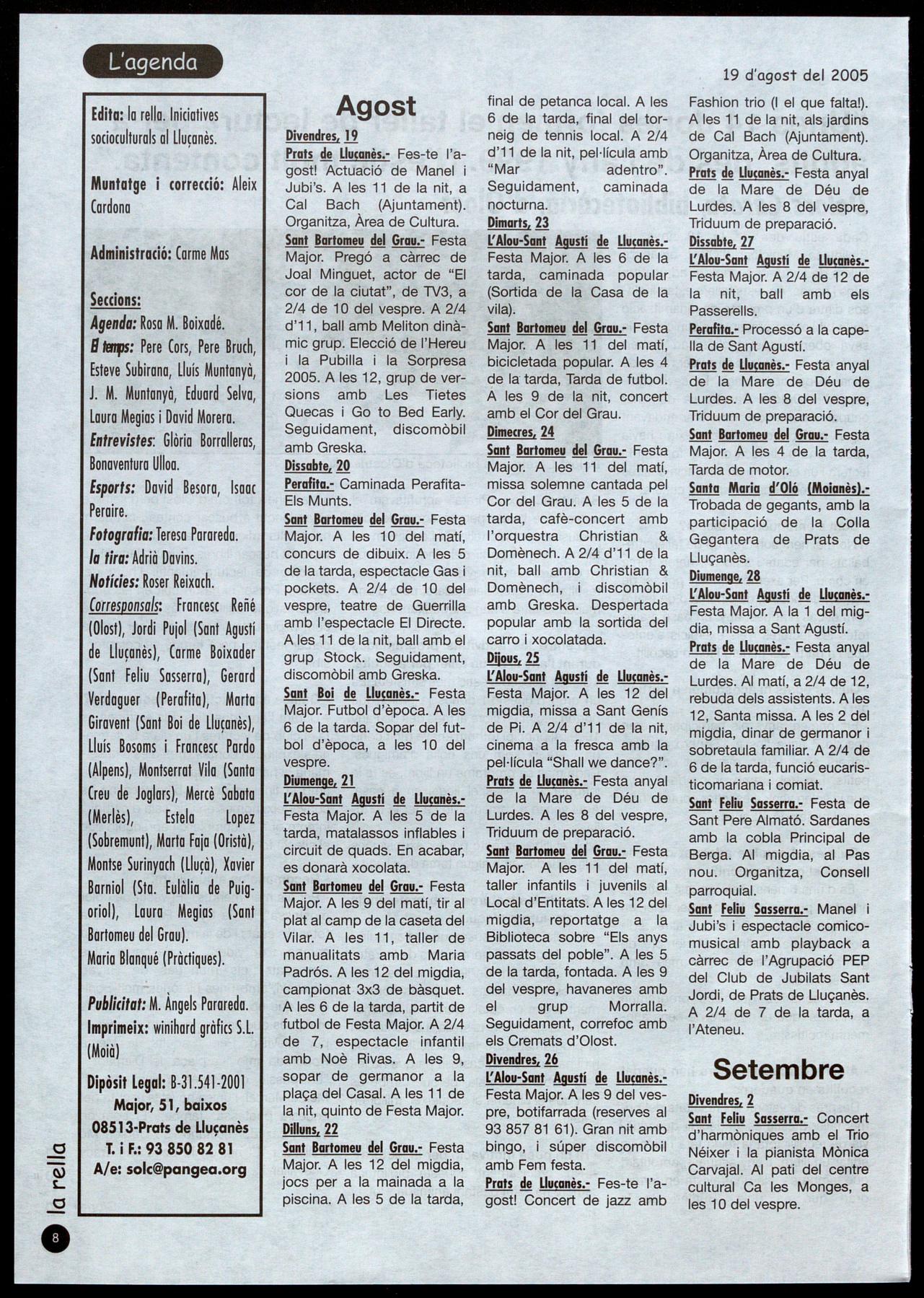 DONA, POSA'T AL DIA.-Dona, posa't el dia és un programa formatiu que organitza el Consorci del Lluçanès. En aquest curset es podrà treballar una sèrie de tallers bàsics: d'escriptura que es duran a terme tots els dilluns a partir del 12 de setembre fins el 19 de desembre. Els tallers d'iniciació a internet correu electrònic que es faran tots els dimecres a partir del 14 de setembre fins el 14 de desembre. També s'organitzaran tallers de coneixement personal: un per millorar l'autoestima, del 26 al 30 de setembre, l'altre de comunicació que s'iniciarà el 24 d'octubre i acabarà el dia 28 del mateix mes, l'últim per cuidar el nostre cos mantenir un bon estat de salut, que començarà el dia 21 de novembre acabarà el 25 de novembre.