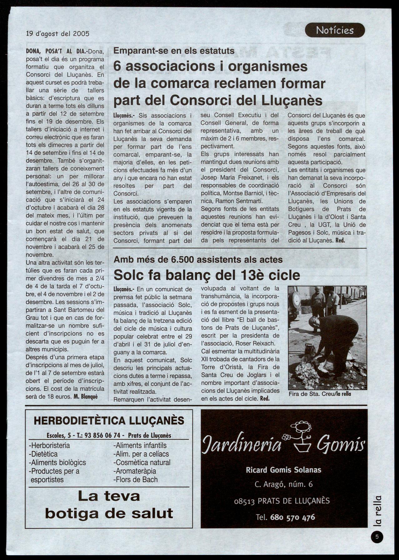 Lluçanès.- Sis associacions organismes de la comarca han fet arribar al Consorci del Lluçanès la seva demanda per formar part de l'ens comarcal, emparant-se, la majoria d'elles, en les peticions efectuades fa més d'un any i que encara no han estat resaltes per part del Consorci.