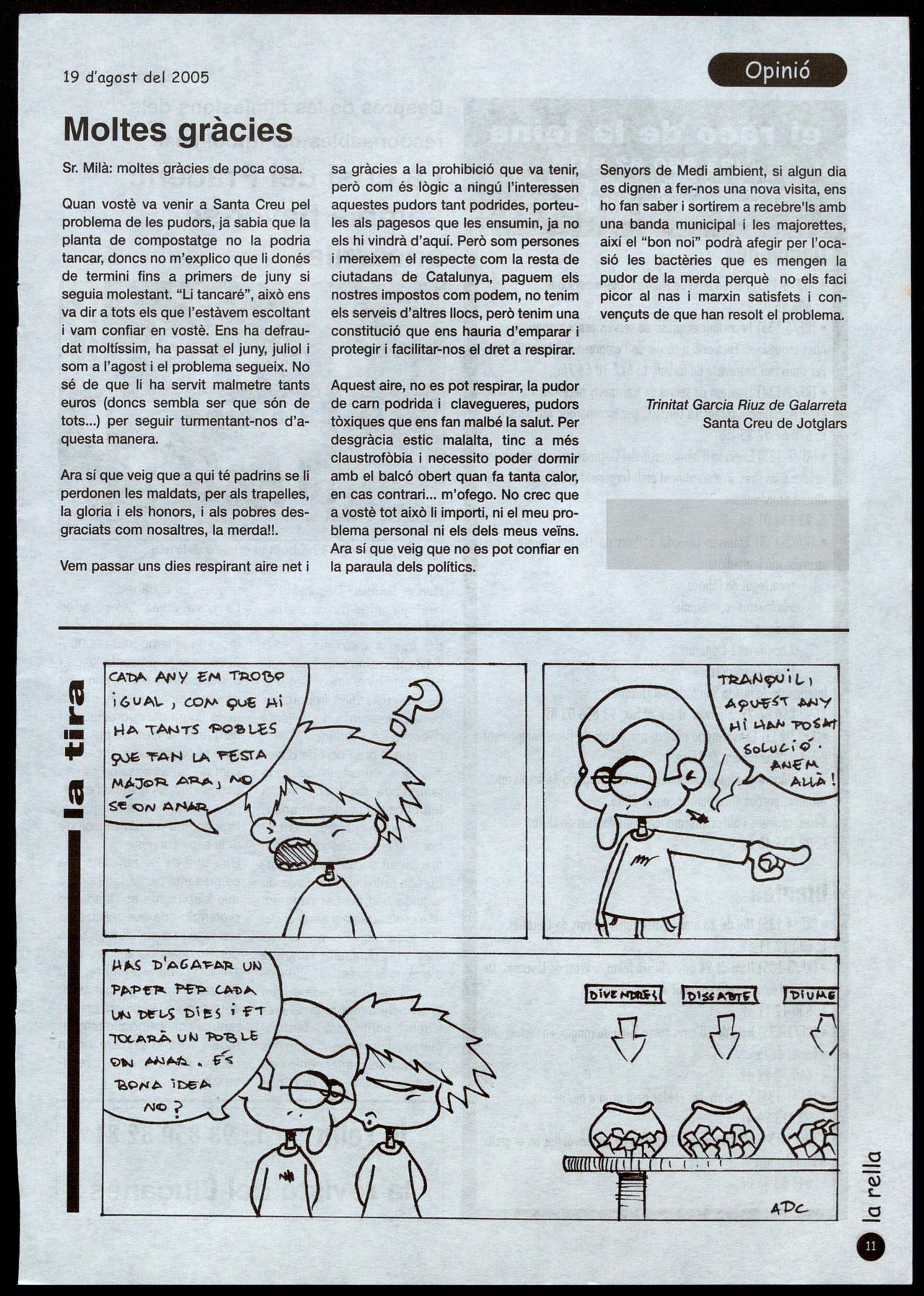 Flnalrnent, el col-lectiu espera que, en compliment de la promesa que va fer el Conseller Milà en el sentit que si les molèsties persistien caldria fer tancar la planta, esperen que això es faci efectiu ben aviat.