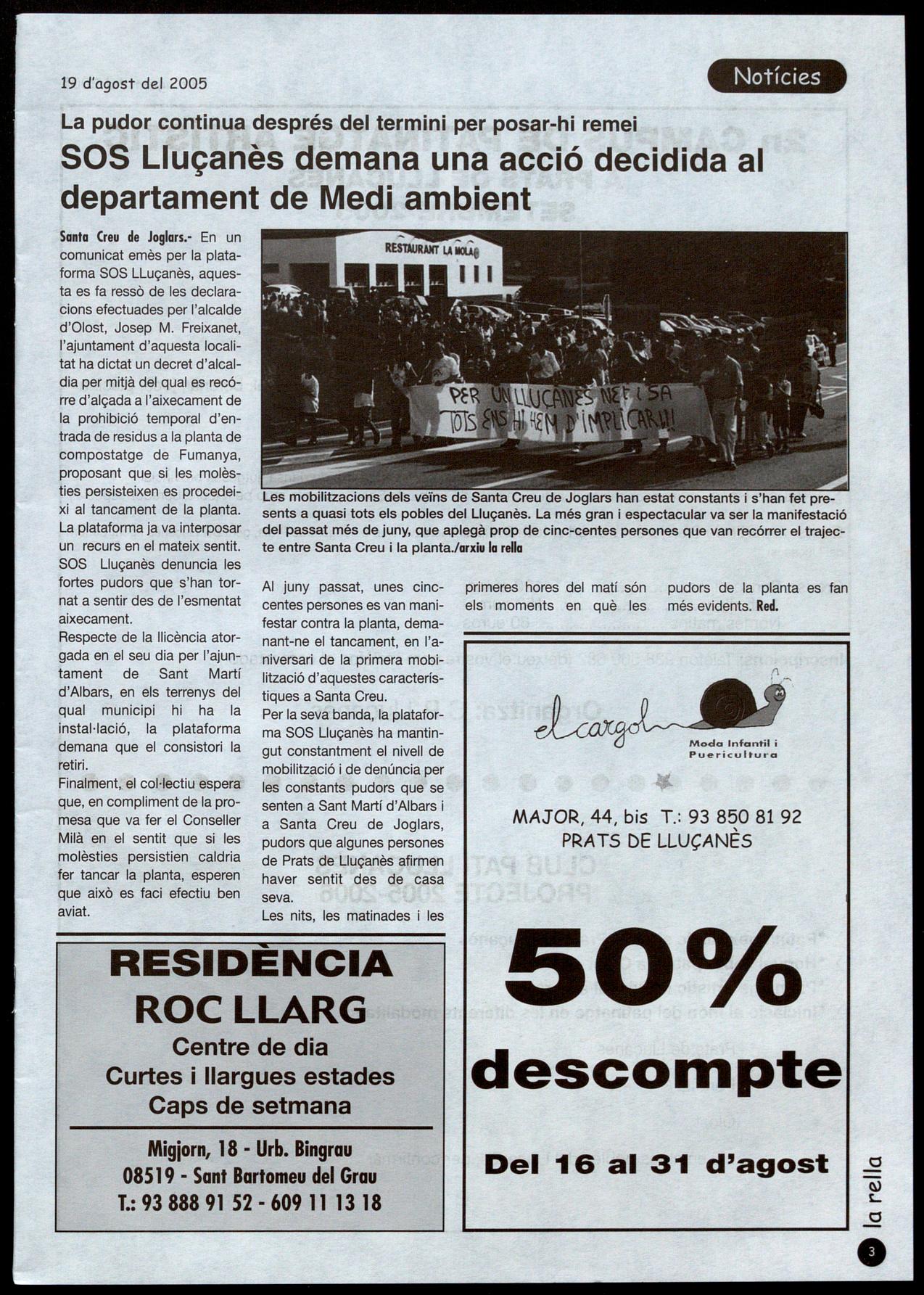 Santa Creu de Joglars.- En un comunicat emès per la plataforma SOS LLuçanès, aquesta es fa ressò de les declaracions efectuades per l'alcalde d'Olost, Josep M. Freixanet, l'ajuntament d'aquesta localitat ha dictat un decret d'alcaidia per mitjà del qual es recórre d'alçada a l'aixecament de la prohibició temporal d'entrada de residus a la planta de compostatge de Fumanya, proposant que si les molèsties persisteixen es procedeixi al tancament de la planta.