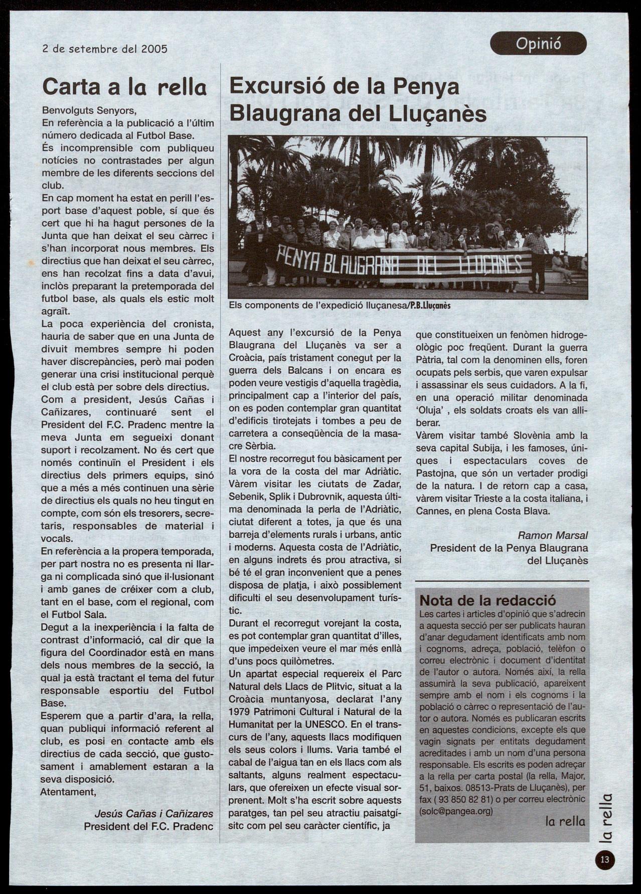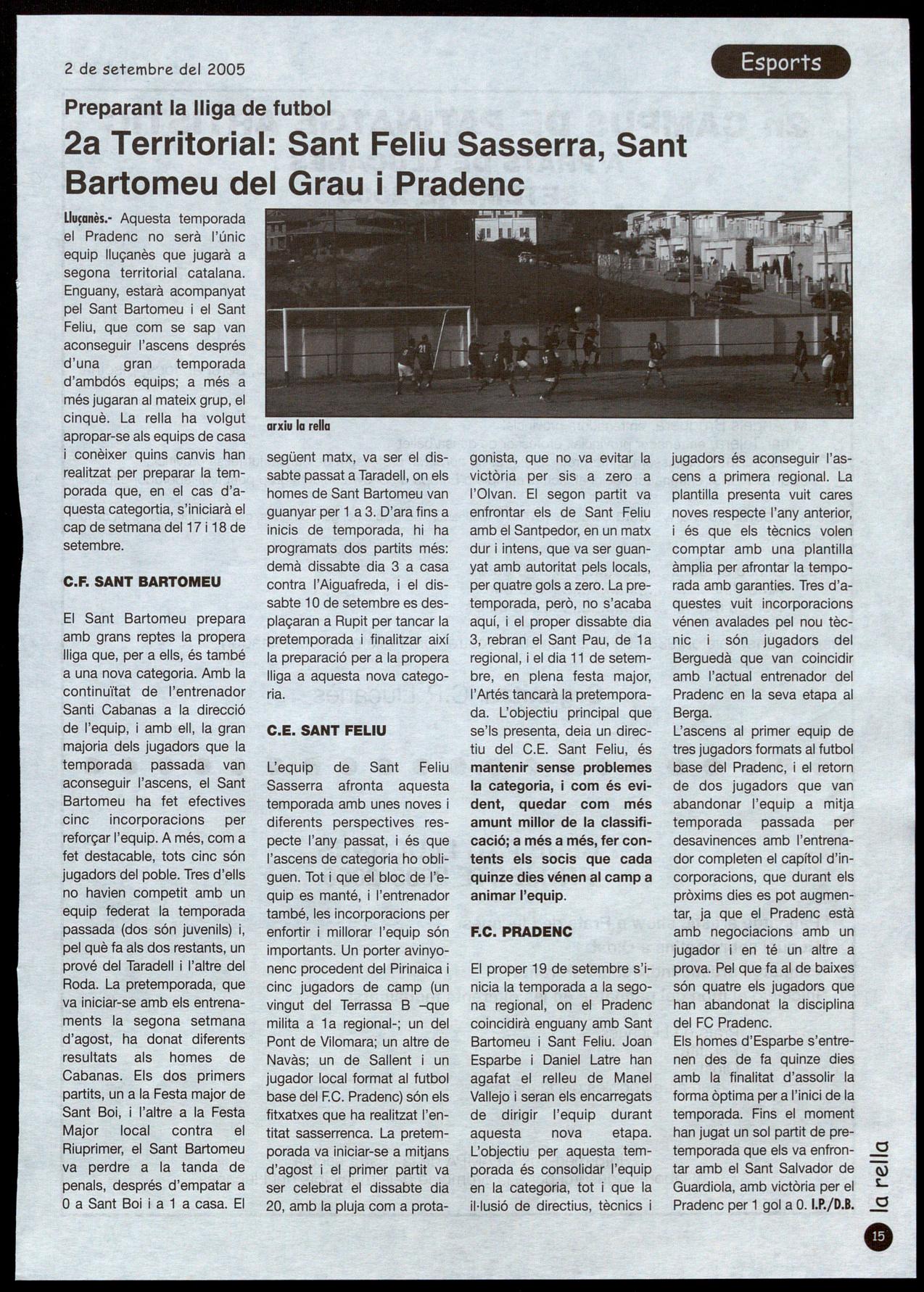 L1uçanès.- Aquesta temporada el Pradenc no serà l'únic equip lluçanès que jugarà a segona territorial catalana. Enguany, estarà acompanyat pel Sant Bartomeu el Sant Feliu, que com se sap van aconseguir l'ascens després d'una gran temporada d'ambdós equips; a més a més jugaran al mateix grup, el cinquè. La rella ha volgut apropar-se als equips de casa conèixer quins canvis han realitzat per preparar la temporada que, en el cas d'aquesta categortia, s'iniciarà el cap de setmana del 17 18 de setembre.