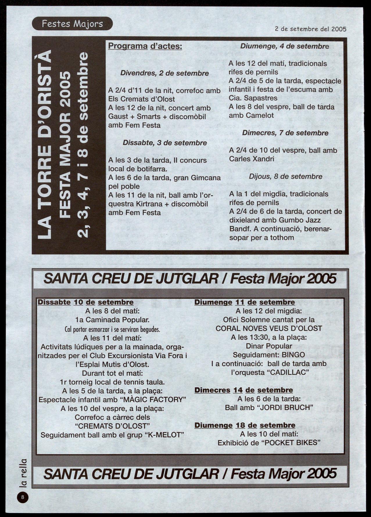 A Olost la festa major programà les 6 hores de natació el dia 7 d'agost, una més que exitosa caminada nocturna (prop de tres-centes persones van participar-hi), un campionat d'excalèxtric, el tradicional partit de futbol femení entre solteres i casades (amb 1 a O favorable a les casades) i la baixada de carretons. També estava prevista la tarda de motor, però la sequera que afecta la zona va aconsellar anul·lar la cita i programar-la per més enda-