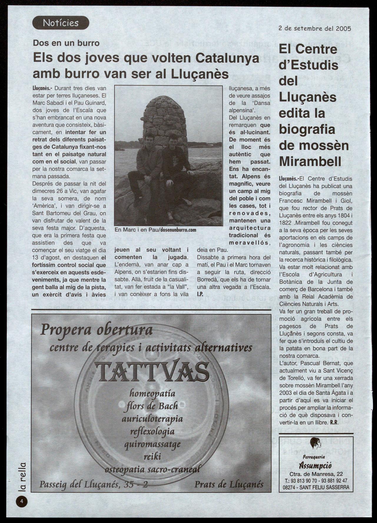 Lluçanès.- Durant tres dies van estar per terres lluçaneses. El Marc Sabadí el Pau Guinard, dos joves de l'Escala que s'han embrancat en una nova aventura que consisteix, bàsicament, en intentar fer un retrat dels diferents paisatges de Catalunya fixant-nos tant en el paisatge natural com en el social, van passar per la nostra comarca la setmana passada.