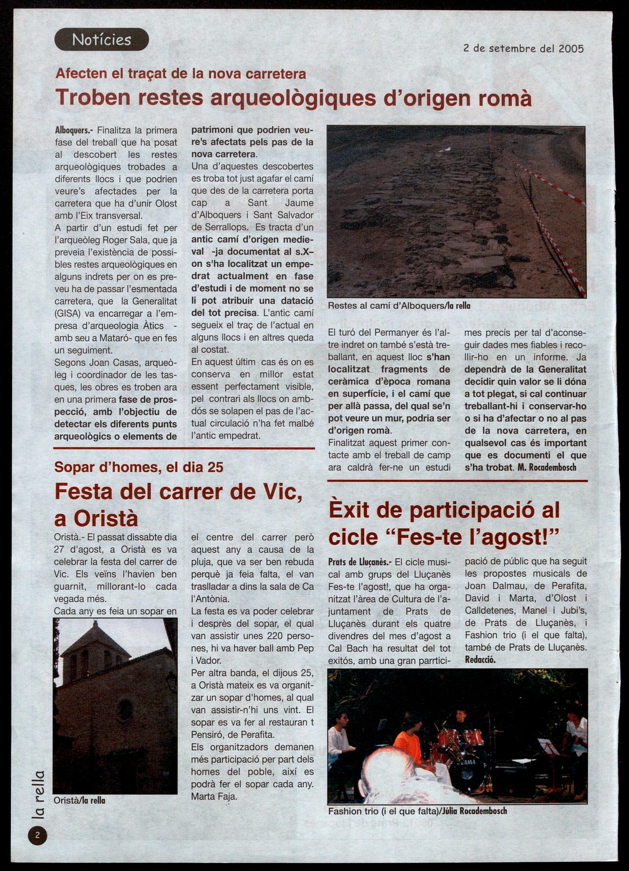 Alboquers.- Finalitza la primera fase del treball que ha posat al descobert les restes arqueològiques trobades a diferents llocs que podrien veure's afectades per la carretera que ha d'unir Olost amb l'Eix transversal.