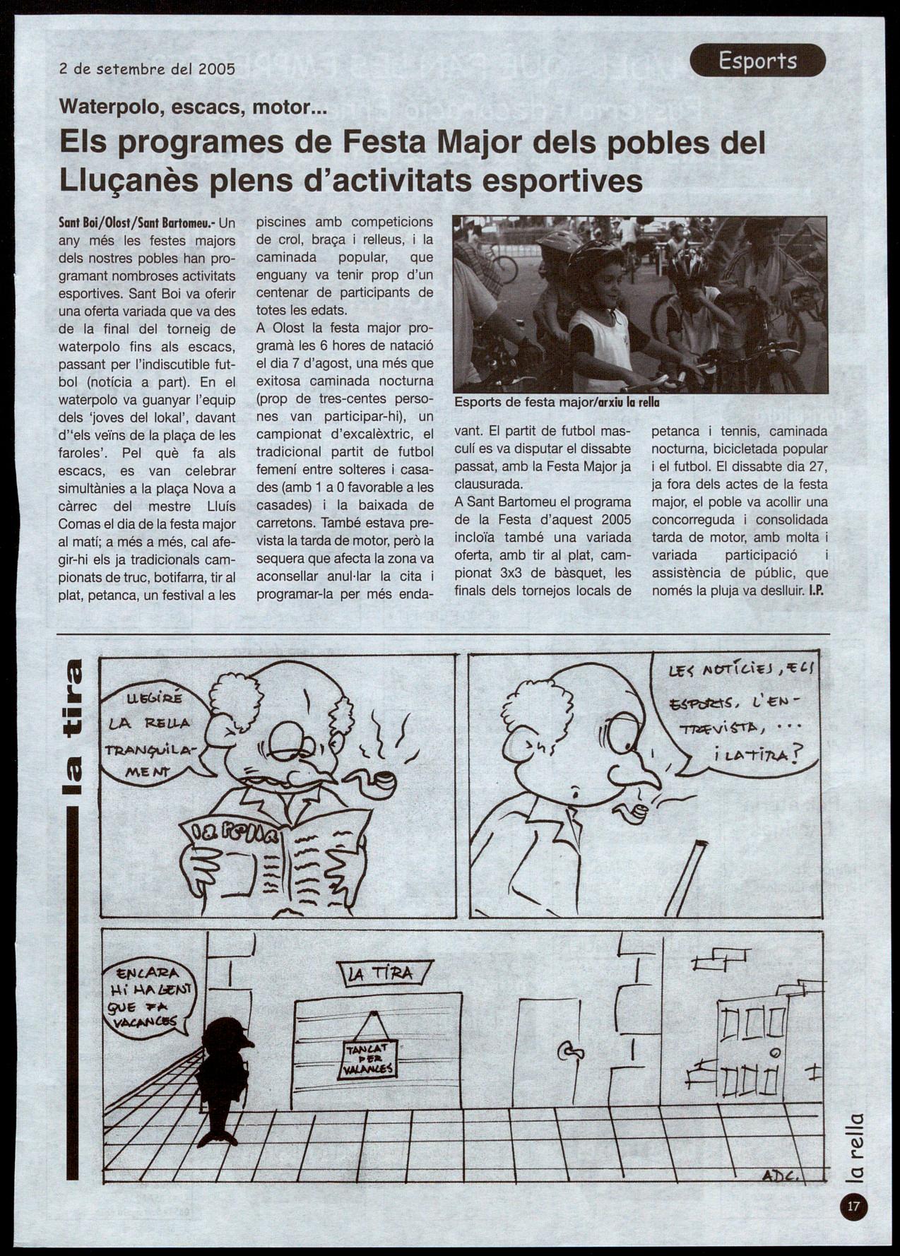 Sant Boi/Olost/Sant Bartomeu.- Un any més les festes majors dels nostres pobles han programant nombroses activitats esportives. Sant Boi va oferir una oferta variada que va des de la final del torneig de waterpolo fins als escacs, passant per l'indiscutible futbol (notícia a part). En el waterpolo va guanyar l'equip dels 'joves del lokal', davant d"els veïns de la plaça de les faroles'. Pel què fa als escacs, es van celebrar simultànies a la plaça Nova a càrrec del mestre Lluís Comas el dia de la festa majar al matí; a més a més, cal afegir-hi els ja tradicionals campionats de truc, botifarra, tir al plat, petanca, un festival a les