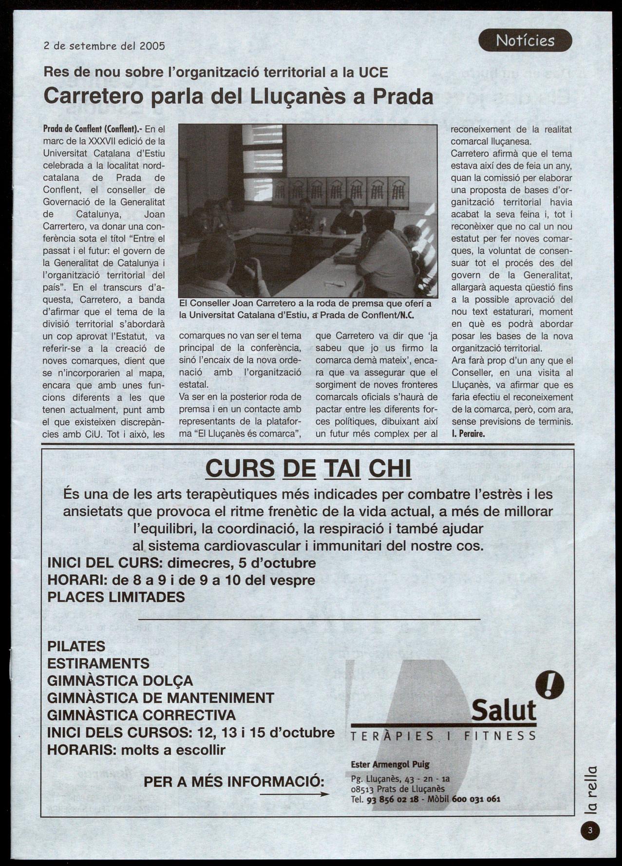 Prado de Conflent (Conflent).- En el marc de la XXXVII edició de la Universitat Catalana d'Estiu celebrada a la localitat nordcatalana de Prada de Conflent, el conseller de Governació de la Generalitat de Catalunya, Joan Carrertero, va donar una conferència sota el títol "Entre el passat el futur: el govern de la Generalitat de Catalunya l'organització territorial del país". En el transcurs d'aquesta, Carretera, a banda d'afirmar que el tema de la divisió territorial s'abordarà un cop aprovat l'Estatut, va referir-se a la creació de noves comarques, dient que se n'incorporarien al mapa, encara que amb unes funcions diferents a les que tenen actualment, punt amb el que existeixen discrepàncies amb CiU. Tot i això, les