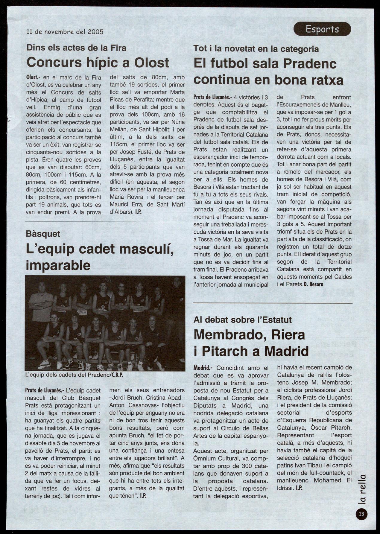 Prats de Llu�anès." 4 victòries i 3 derrotes. Aquest és el bagatge que comptabilitza el Pradenc de futbol sala després de la disputa de set jornades a la Territorial Catalana del futbol sala català. Els de Prats estan realitzant un esperançador inici de temporada, tenint en compte que és una categoria totalment nova per a ells. Els homes de Besora i Vilà estan tractant de tu a tu a tots els seus rivals. Tan és així que en la última jornada disputada fins al moment el Pradenc va aconseguir una treballada i merescuda victòria en la seva visita a Tossa de Mar. La igualtat va regnar durant els quaranta minuts de joc, en un partit que no es va decidir fins al tram final. El Pradenc arribava a Tossa havent ensopegat en l'anterior jornada al municipal de Prats enfront l'Escuraxemeneis de Manlleu, que va imposar-se per 1 gol a 3, tot i no fer prous mèrits per aconseguir els tres punts. Els de Prats, doncs, necessitaven una victòria per tal de refer-se d'aquesta primera derrota actuant com a locals. Tot anar bona part del partit a remolc del marcador, els homes de Besora Vilà, com ja sol ser habitual en aquest tram inicial de competició, van forçar la màquina als segons vint minuts i van acabar imposant-se al Tossa per 3 gols a 5. Aquest important triomf situa els de Prats en la part alta de la classificació, on registren un total de dotze punts. Elliderat d'aquest grup segon de la Territorial Catalana està compartit en aquests moments pel Caldes el Parets.D. Besora