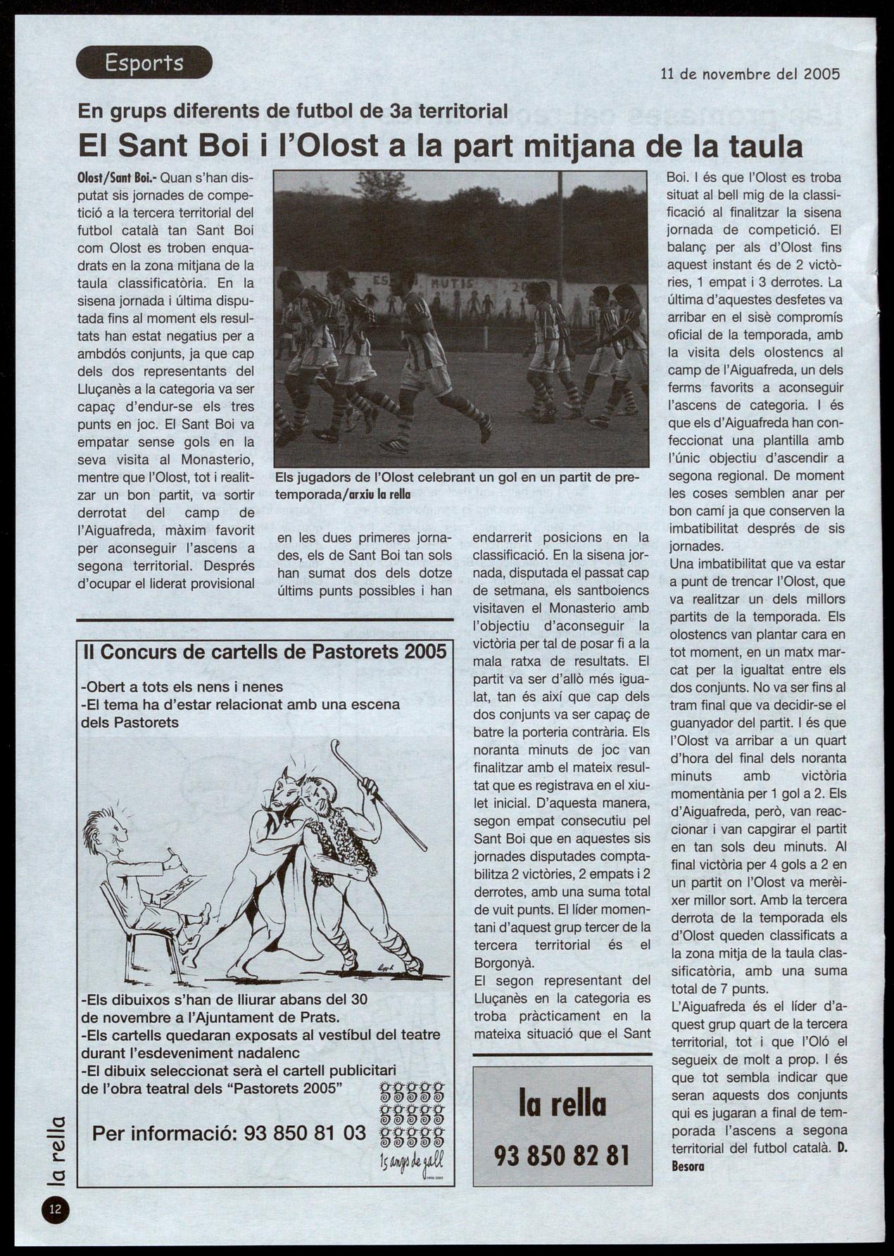 Olosl/Sonl Boi.- Quan s'han disputat sis jornades de competició a la tercera territorial del futbol català tan Sant Boi com Olost es troben enquadrats en la zona mitjana de la taula classificatòria. En la sisena jornada i última disputada fins al moment els resultats han estat negatius per a ambdós conjunts, ja que cap dels dos representants del Lluçanès a la categoria va ser capaç d'endur-se els tres punts en joc. El Sant Boi va empatar sense gols en la seva visita al Monasterio, mentre que l'Olost, tot realitzar un bon partit, va sortir derrotat del camp de l'Aiguafreda, màxim favorit per aconseguir l'ascens a segona territorial. Després d'ocupar elliderat provisional