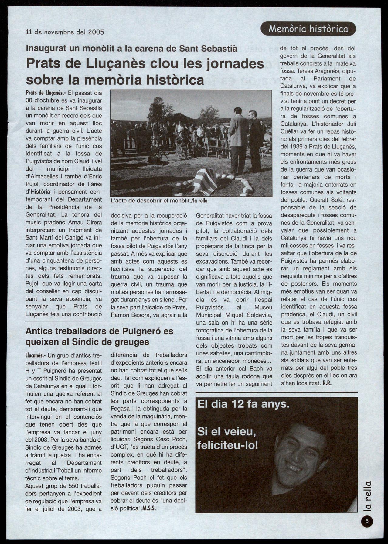 Prats de Lluçanès.- El passat dia 30 d'octubre es va inaugurar a la carena de Sant Sebastià un monòlit en record dels que van morir en aquest lloc durant la guerra civil. L'acte va comptar amb la presència dels familiars de l'únic cos identificat a la fossa de Puigvistós de nom Claudi i veí del municipi lleidatà d'Almacelles també d'Enric Pujol, coordinador de l'àrea d'Història i pensament contemporani del Departament L'acte de descobrir el monòlit.lla rella de la Presidència de la Generalitat. La tenora del músic pradenc Arnau Cirera interpretant un fragment de Sant Martí del Canigó va iniciar una emotiva jornada que va comptar amb l'assistència d'una cinquantena de persones, alguns testimonis directes dels fets rememorats. Pujol, que va llegir una carta del conseller en cap disculpant la seva absència, va senyalar que Prats de Lluçanès feia una contribució