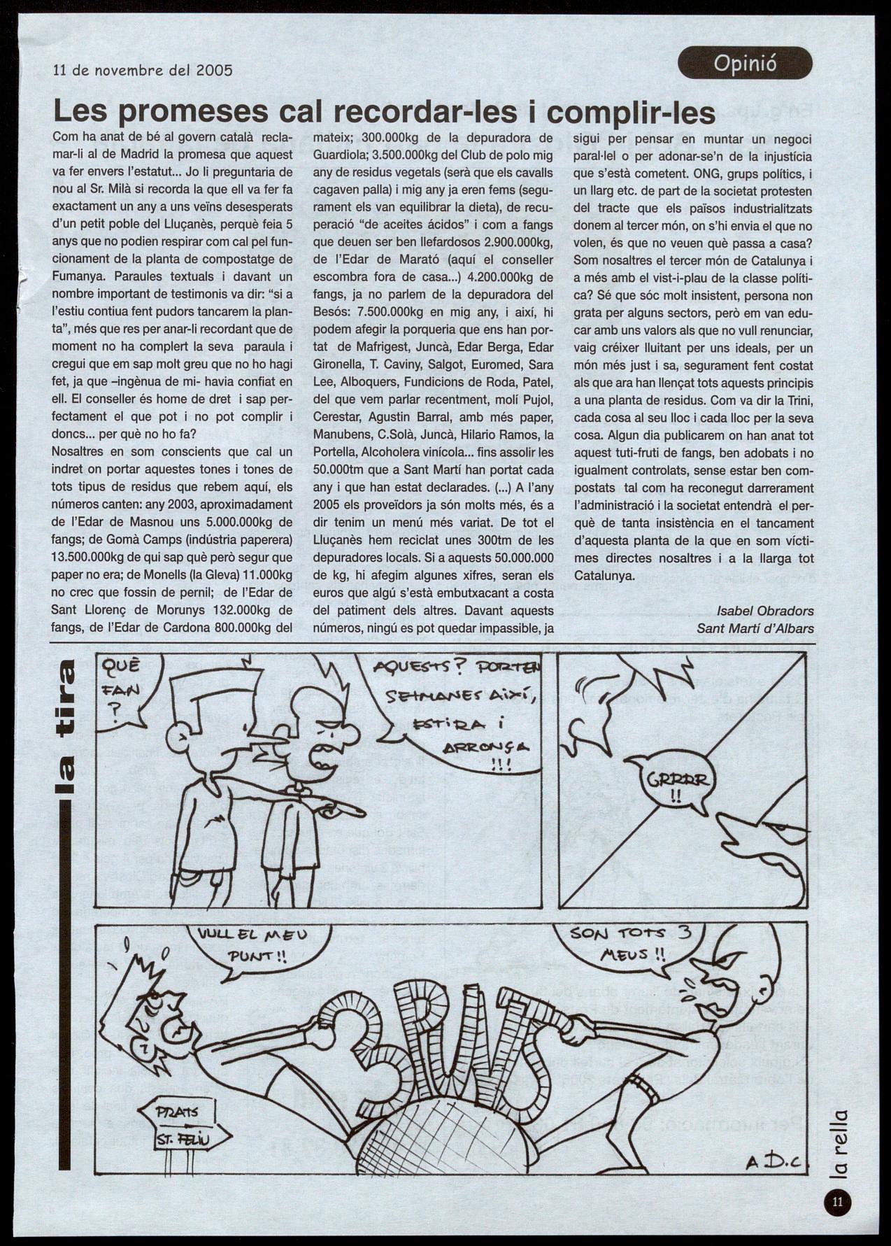 sigui per pensar en muntar un negoci paral·lel o per adonar-se'n de la injustícia que s'està cometent. ONG, grups polítics, i un llarg etc. de part de la societat protesten del tracte que els països industrialitzats donem al tercer món, on s'hi envia el que no volen, és que no veuen què passa a casa? Som nosaltres el tercer món de Catalunya i a més amb el vist-i-plau de la classe política? Sé que sóc molt insistent, persona non grata per alguns sectors, però em van educar amb uns valors als que no vull renunciar, vaig créixer lluitant per uns ideals, per un món més just sa, segurament fent costat als que ara han llençat tots aquests principis a una planta de residus. Com va dir la Trini, cada cosa al seu lloc i cada lloc per la seva cosa. Algun dia publicarem on han anat tot aquest tuti-fruti de fangs, ben adobats no igualment controlats, sense estar ben compostats tal com ha reconegut darrerament l'administració i la societat entendrà el perquè de tanta insistència en el tancament d'aquesta planta de la que en som víctimes directes nosaltres i a la llarga tot Catalunya.