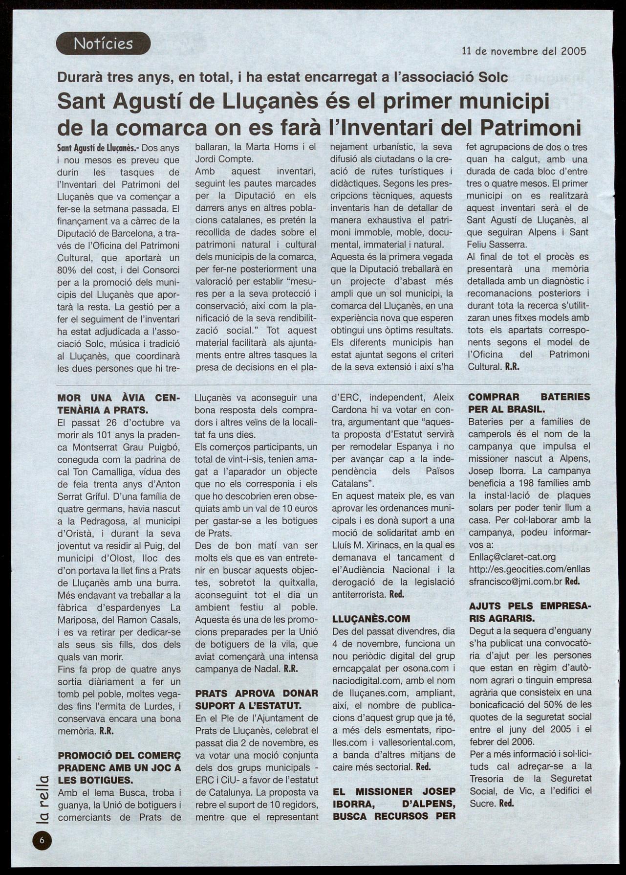 Sant Agustí de Llu�anès.- Dos anys nou mesos es preveu que durin les tasques de l'Inventari del Patrimoni del Lluçanès que va començar a fer-se la setmana passada. El finançament va a càrrec de la Diputació de Barcelona, a través de l'Oficina del Patrimoni Cultural, que aportarà un 80% del cost, i del Consorci per a la promoció dels municipis del Lluçanès que aportarà la resta. La gestió per a fer el seguiment de l'inventari ha estat adjudicada a l'associació Solc, música tradició al Lluçanès, que coordinarà les dues persones que hi tre-