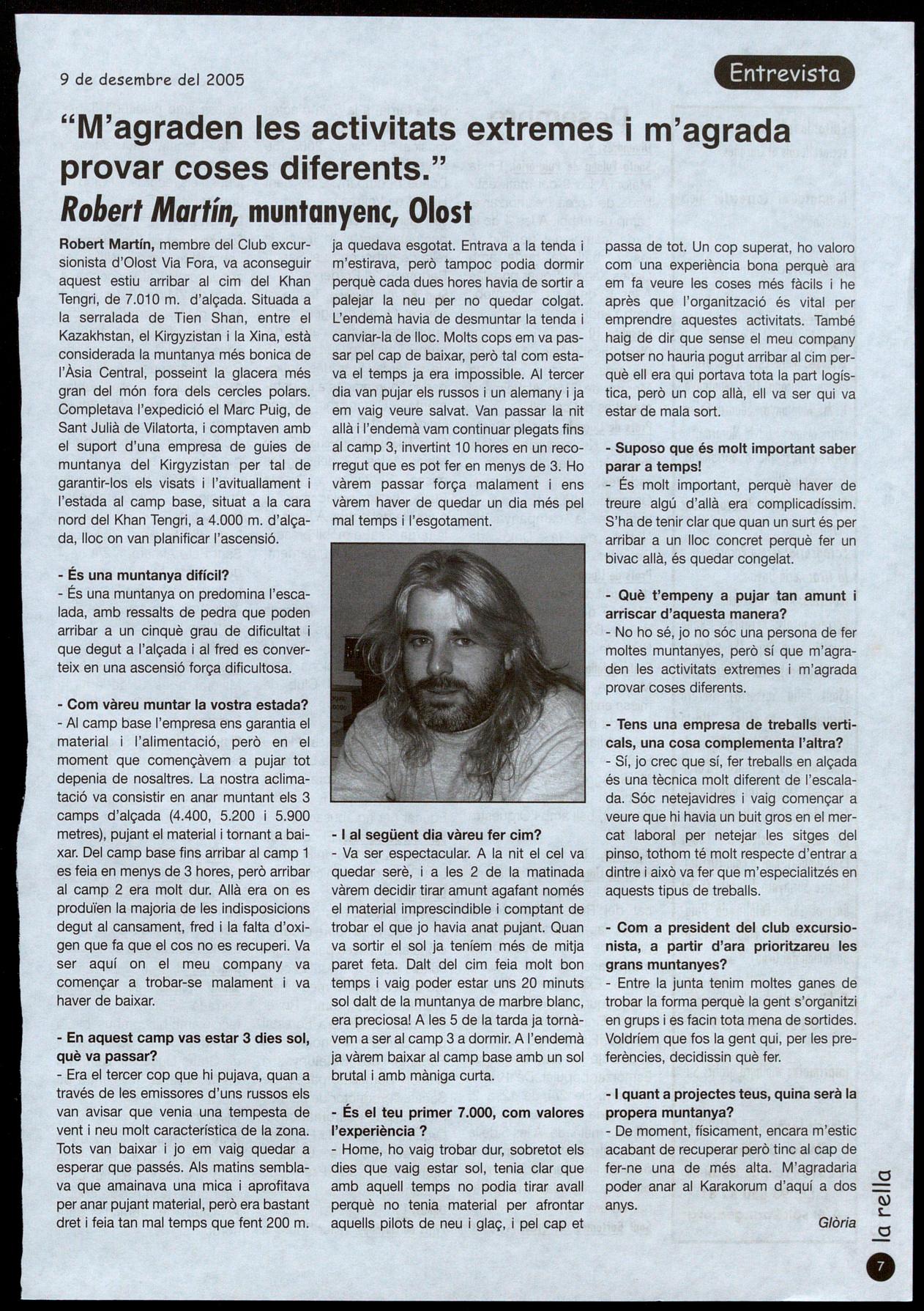 Robert Martín, membre del Club excursionista d'Olost Via Fora, va aconseguir aquest estiu arribar al cim del Khan Tengri, de 7.010 m. d'alçada. Situada a la serralada de Tien Shan, entre el Kazakhstan, el Kirgyzistan i la Xina, està considerada la muntanya més bonica de l'Àsia Central, posseint la glacera més gran del món fora dels cercles polars. Completava l'expedició el Marc Puig, de Sant Julià de Vilatorta, comptaven amb el suport d'una empresa de guies de muntanya del Kirgyzistan per tal de garantir-los els visats l'avituallament l'estada al camp base, situat a la cara nord del Khan Tengri, a 4.000 m. d'alçada, lloc on van planificar l'ascensió.