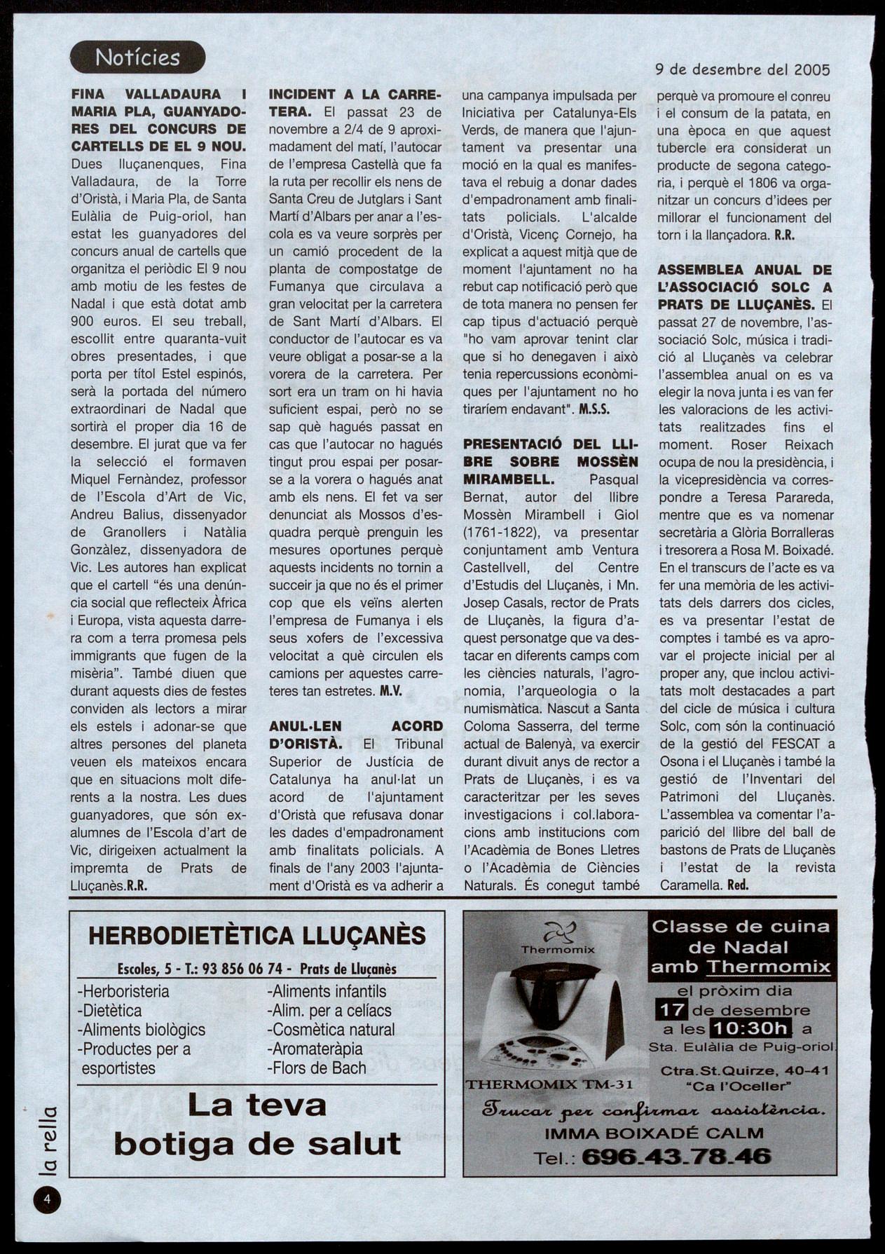 ASSEMBLEA ANUAL DE L'ASSOCIACiÓ SOLC A PRATS DE LLUÇANÈS. El passat 27 de novembre, l'associació Solc, música i tradició al Lluçanès va celebrar l'assemblea anual on es va elegir la nova junta i es van fer les valoracions de les activitats realitzades fins el moment. Roser Reixach ocupa de nou la presidència, i la vicepresidència va correspondre a Teresa Parareda, mentre que es va nomenar secretària a Glòria Borralleras i tresorera a Rosa M. Boixadé. En el transcurs de l'acte es va fer una memòria de les activitats dels darrers dos cicles, es va presentar l'estat de comptes i també es va aprovar el projecte inicial per al proper any, que inclou activitats molt destacades a part del cicle de música cultura Solc, com són la continuació de la gestió del FESCAT a Osona el Lluçanès i també la gestió de l'Inventari del Patrimoni del Lluçanès. L'assemblea va comentar l'aparició del llibre del ball de bastons de Prats de Lluçanès i l'estat de la revista Caramella. Red.
