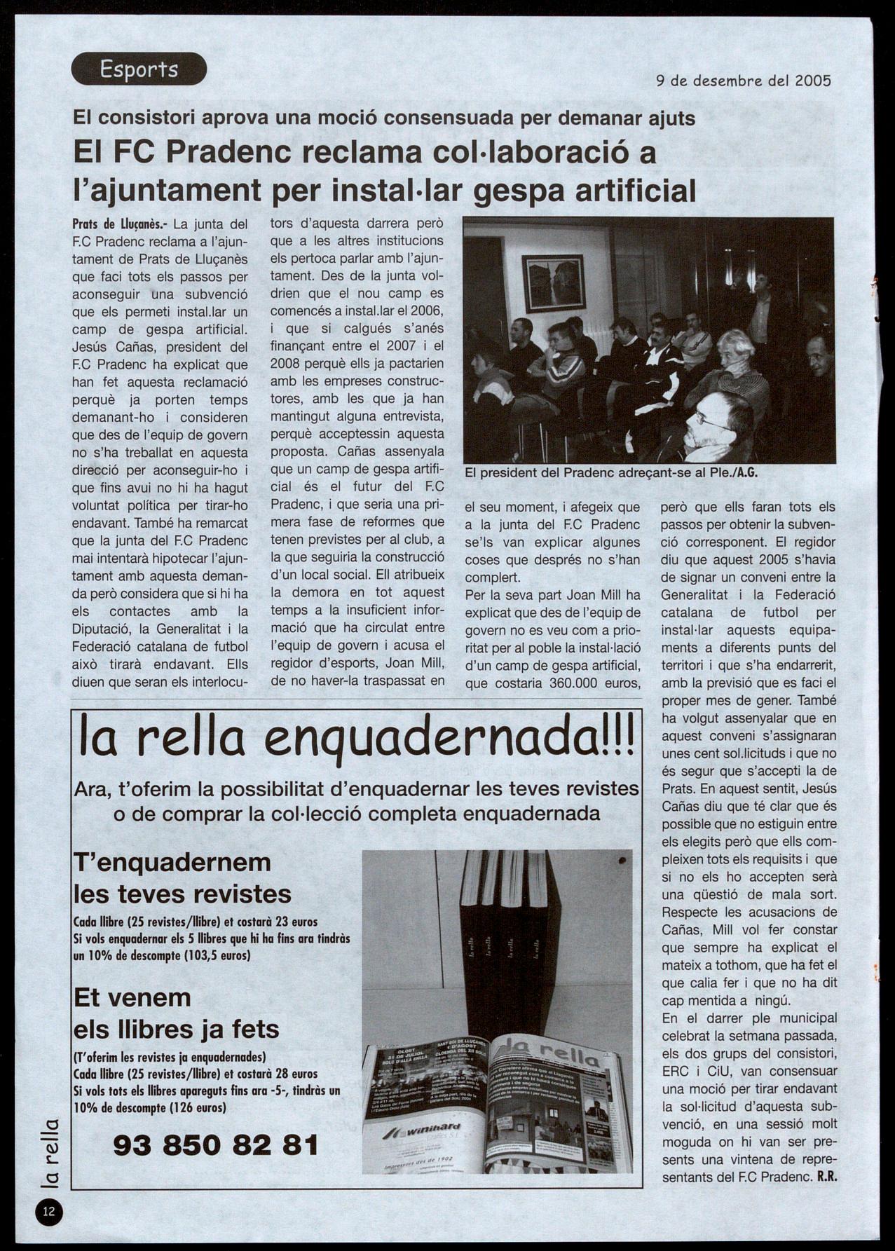però que elis faran tots els passos per obtenir la subvenció corresponent. El regidor diu que aquest 2005 s'havia de signar un conveni entre la Generalitat la Federació catalana de futbol per instal·lar aquests equipaments a diferents punts del territori que s'ha endarrerit, amb la previsió que es faci el proper mes de gener. També ha volgut assenyalar que en aquest conveni s'assignaran unes cent sol.licituds i que no és segur que s'accepti la de Prats. En aquest sentit, Jesús Cañas diu que té clar que és possible que no estiguin entre els elegits però que elis compleixen tots els requisits i que si no els ho accepten serà una qüestió de mala sort. Respecte les acusacions de Cañas, Mill vol fer constar que sempre ha explicat el mateix a tothom, que ha fet el que calia fer que no ha dit cap mentida a ningú. En el darrer ple municipal celebrat la setmana passada, els dos grups del consistori, ERC CiU, van consensuar una moció per tirar endavant la sol·licitud d'aquesta subvenció, en una sessió molt moguda on hi van ser presents una vintena de representants del FC Pradenc. R.R.