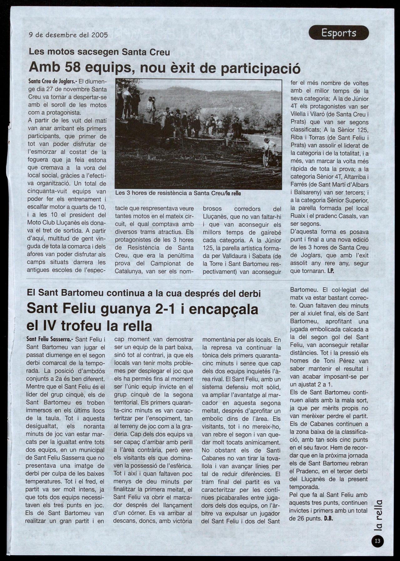 Santa Creu de Joglars.- El diumenge dia 27 de novembre Santa Creu va tornar a despertar-se amb el soroll de les motos com a protagonista. A partir de les vuit del matí van anar arribant els primers participants, que primer de tot van poder disfrutar de l'esmorzar al costat de la foguera que ja feia estona que cremava a la vora del local social, gràcies a l'efectiva organització. Un total de cinquanta-vuit equips van poder fer els entrenament escalfar motor a quarts de 10, i a les 10 el president del Moto Club Lluçanès els donava el tret de sortida. A partir d'aquí, multitud de gent vinguda de tota la comarca dels afores van poder disfrutar als camps situats darrera les antigues escoles de I'espec-