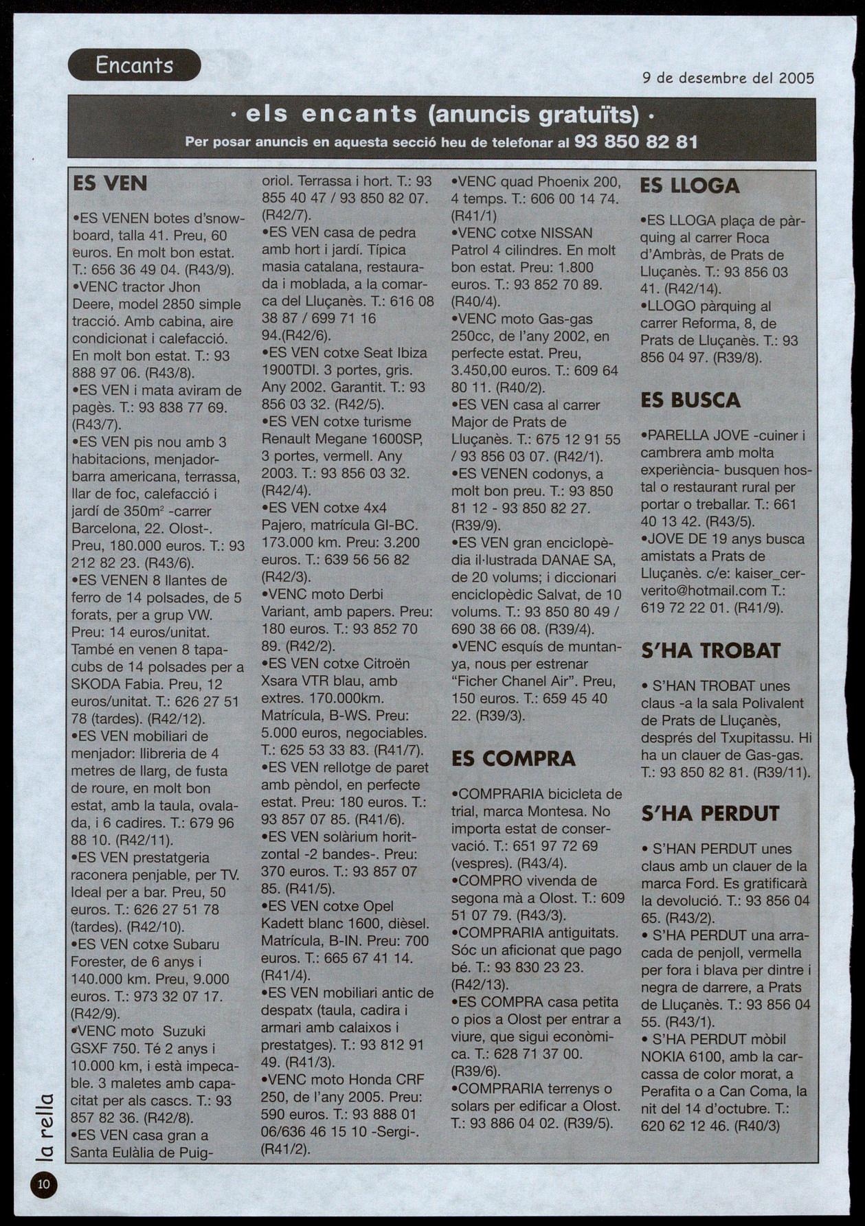molt bon preu. T.: 93 850 tal o restaurant rural per jardí de 350m2 -carrer -ES VEN cotxe 4x4 81 12 - 93 850 82 27. portar o treballar. T.: 661 Barcelona, 22. Olost-. Pajero, matrícula GI-BC. (R39/9). 40 1342. (R43/5). Preu, 180.000 euros. T.: 93 173.000 km. Preu: 3.200 -ES VEN gran enciclopè- -JOVE DE 19 anys busca 2128223. (R43/6). euros. T.: 639 56 56 82 dia il-lustrada DANAE SA, amistats a Prats de -ES VENEN 8 llantes de (R42/3). de 20 volums; diccionari Lluçanès. cie: kaiser_cerferro de 14 polsades, de 5 -VENC moto Derbi enciclopèdic Salvat, de 10 verito@hotmail.com T.: forats, per a grup VW. Variant, amb papers. Preu: volums. T.: 93 850 80 49 / 6197222 01. (R41/9). Preu: 14 euros/unitat. 180 euros. T.: 93 852 70 690 38 66 08. (R39/4). També en venen 8 tapa- 89. (R42/2). -VENC esquís de muntan- S'HA TROBAT cubs de 14 polsades per a -ES VEN cotxe Citroën ya, nous per estrenar SKODA Fabia. Preu, 12 Xsara VTR blau, amb "Ficher Chanel Air". Preu, - S'HAN TROBAT unes euros/unitat. T.: 6262751 extres. 170.000km. 150 euros. T.: 659 45 40 claus -a la sala Polivalent 78 (tardes). (R42/12). Matrícula, B-WS. Preu: 22. (R39/3). de Prats de Lluçanès, -ES VEN mobiliari de 5.000 euros, negociables. menjador: llibreria de 4 T.: 625 53 33 83. (R41/7). després del Txupitassu. Hi metres de llarg, de fusta -ES VEN rellotge de paret