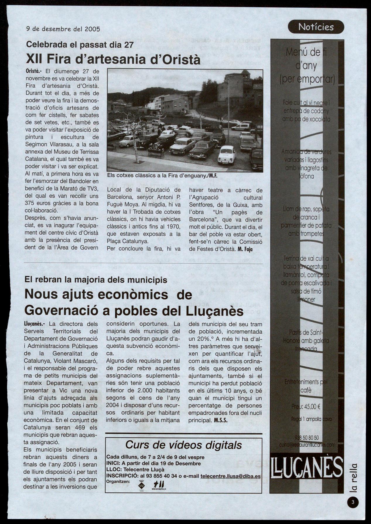 Oristà.- El diumenge 27 de novembre es va celebrar la XII Fira d'artesania d'Oristà. Durant tot el dia, a més de poder veure la fira la demostració d'oficis artesans de com fer cistells, fer sabates de set vetes, etc., també es va poder visitar l'exposició de pintura i escultura de Segimon Vilarasau, a la sala annexa del Museu de Terrissa Catalana, el qual també es va poder visitar va ser explicat. AI matí, a primera hora es va fer l'esmorzar del Bandoler en benefici de la Marató de TV3, del qual es van recollir uns 375 euros gràcies a la bona col·laboració.