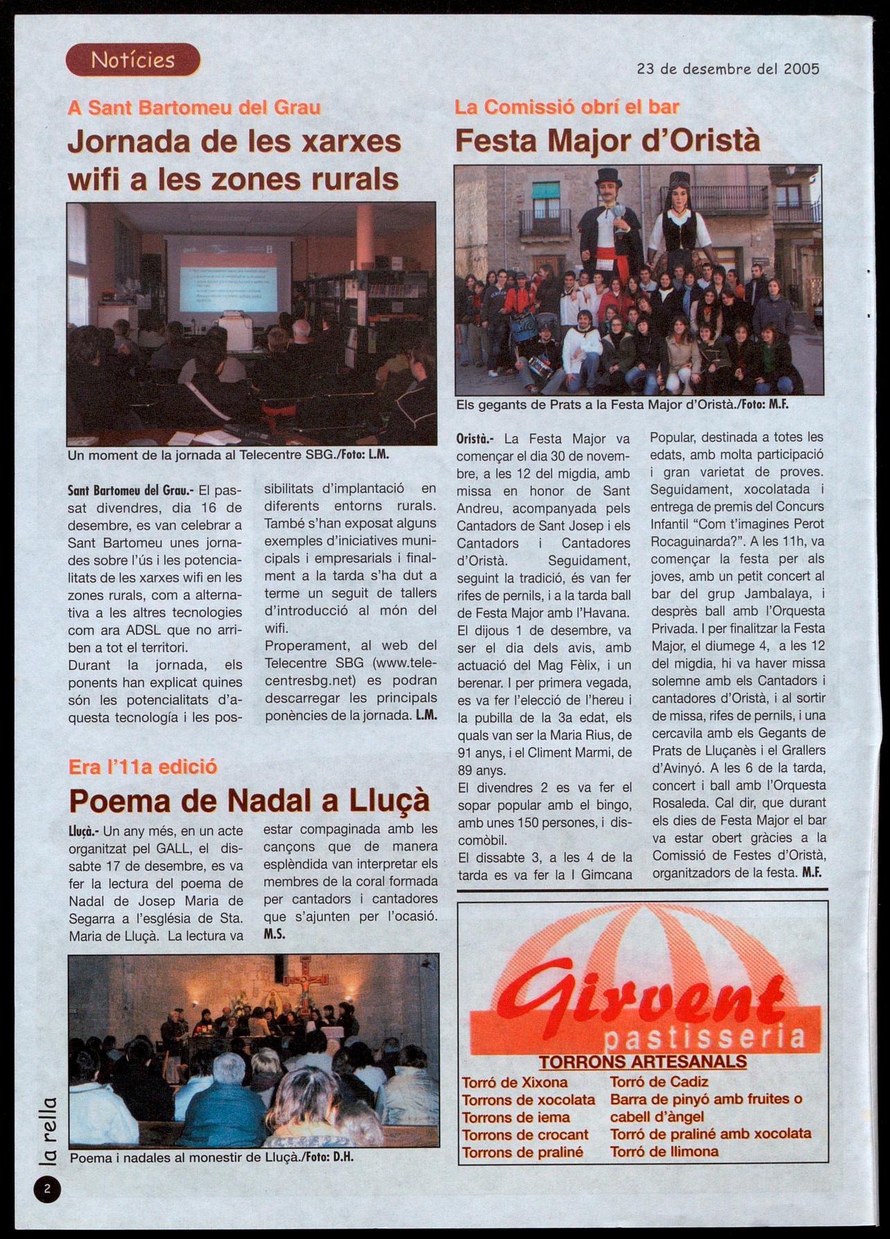 Oristò.· La Festa Major va començar el dia 30 de novembre, a les 12 del migdia, amb missa en honor de Sant Andreu,acompanyada pels Cantadors de Sant Josep els Cantadors Cantadores d'Oristà. Seguidament, seguint la tradició, és van fer rifes de pernils, a la tarda ball de Festa Major amb l'Havana. El dijous 1 de desembre, va ser el dia dels avis, amb actuació del Mag Fèlix, un berenar. per primera vegada, es va fer l'elecció de l'hereu la pubilla de la 3a edat, els quals van ser la Maria Rius, de 91 anys, el Climent Marmi, de 89 anys.
