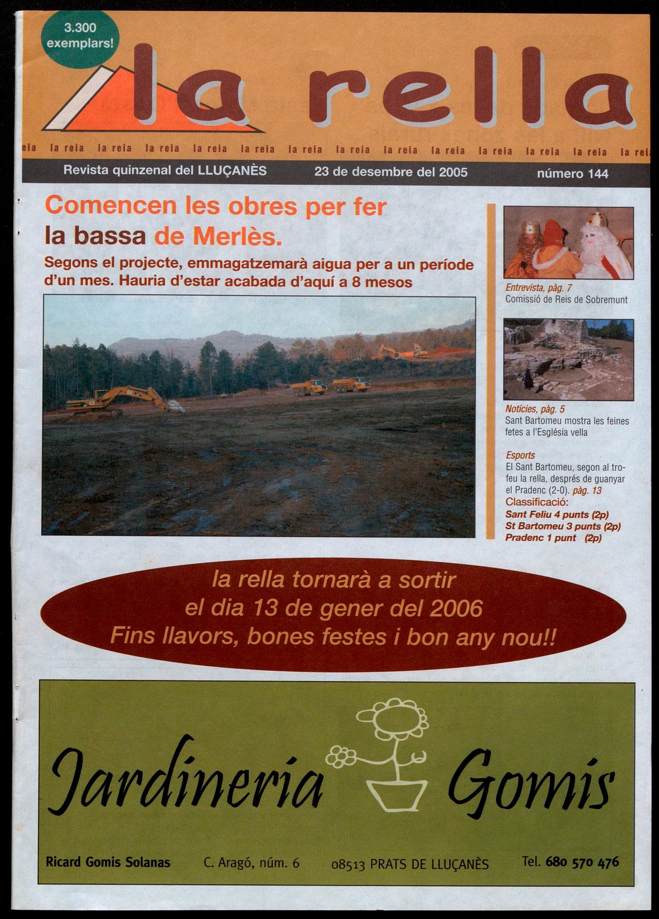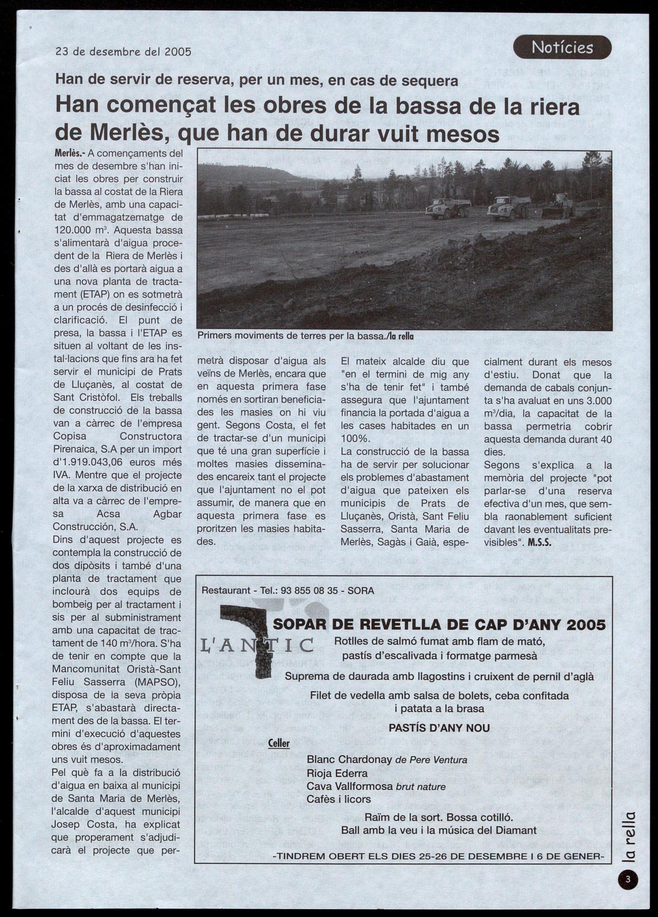 Merlès.- A començaments del mes de desembre s'han iniciat les obres per construir la bassa al costat de la Riera de Merlès, amb una capacitat d'emmagatzematge de 120.000 rn", Aquesta bassa s'alimentarà d'aigua procedent de la Riera de Merlès i des d'allà es portarà aigua a una nova planta de tractament (ETAP) on es sotmetrà a un procés de desinfecció clarificació. El punt de presa, la bassa I'ETAP es situen al voltant de les instal·lacions que fins ara ha fet servir el municipi de Prats de Lluçanès, al costat de Sant Cristòfol. Els treballs de construcció de la bassa van a càrrec de l'empresa